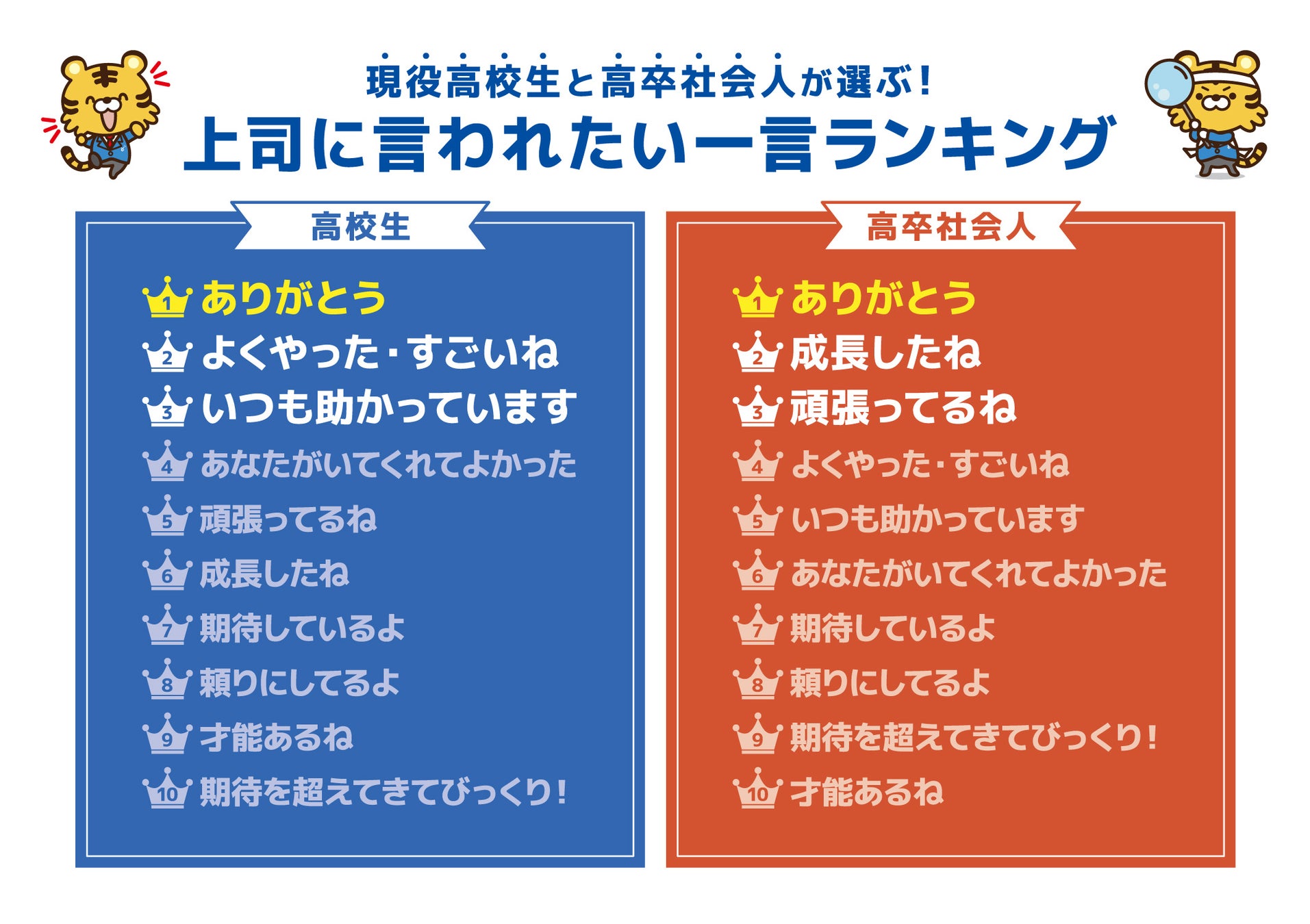 「上司に言われたい一言ランキング」では、高校生と高卒社会人ともに1位は「ありがとう」でした。現役高校生からは3年連続で選ばれています。