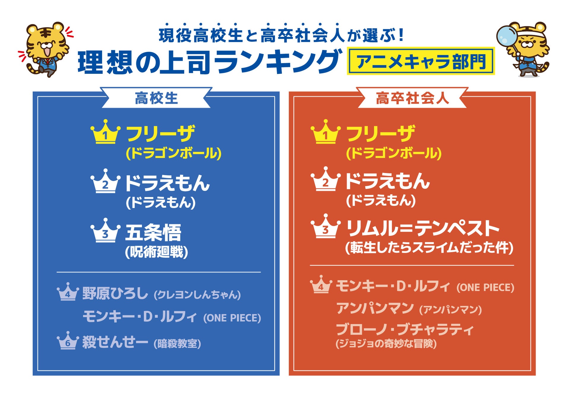 「理想の上司ランキング」のアニメキャラ部門では、現役高校生と高卒社会人ともに、1位にはドラゴンボールの敵役の「フリーザ」が、2位には「ドラえもん」が選ばれました。高校生では、3位に呪術廻戦の「五条悟」、4位にクレヨンしんちゃん父親の「野原ひろし」とONE PIECEの主人公「モンキー・D・ルフィ」が選ばれました。対して、高卒の社会人からは、3位に転生したらスライムだった件の主人公「リムル=テンペスト」、4位に「モンキー・D・ルフィ」「アンパンマン」、ジョジョの奇妙な冒険「ブローノ・ブチャラティ」が選ばれました。