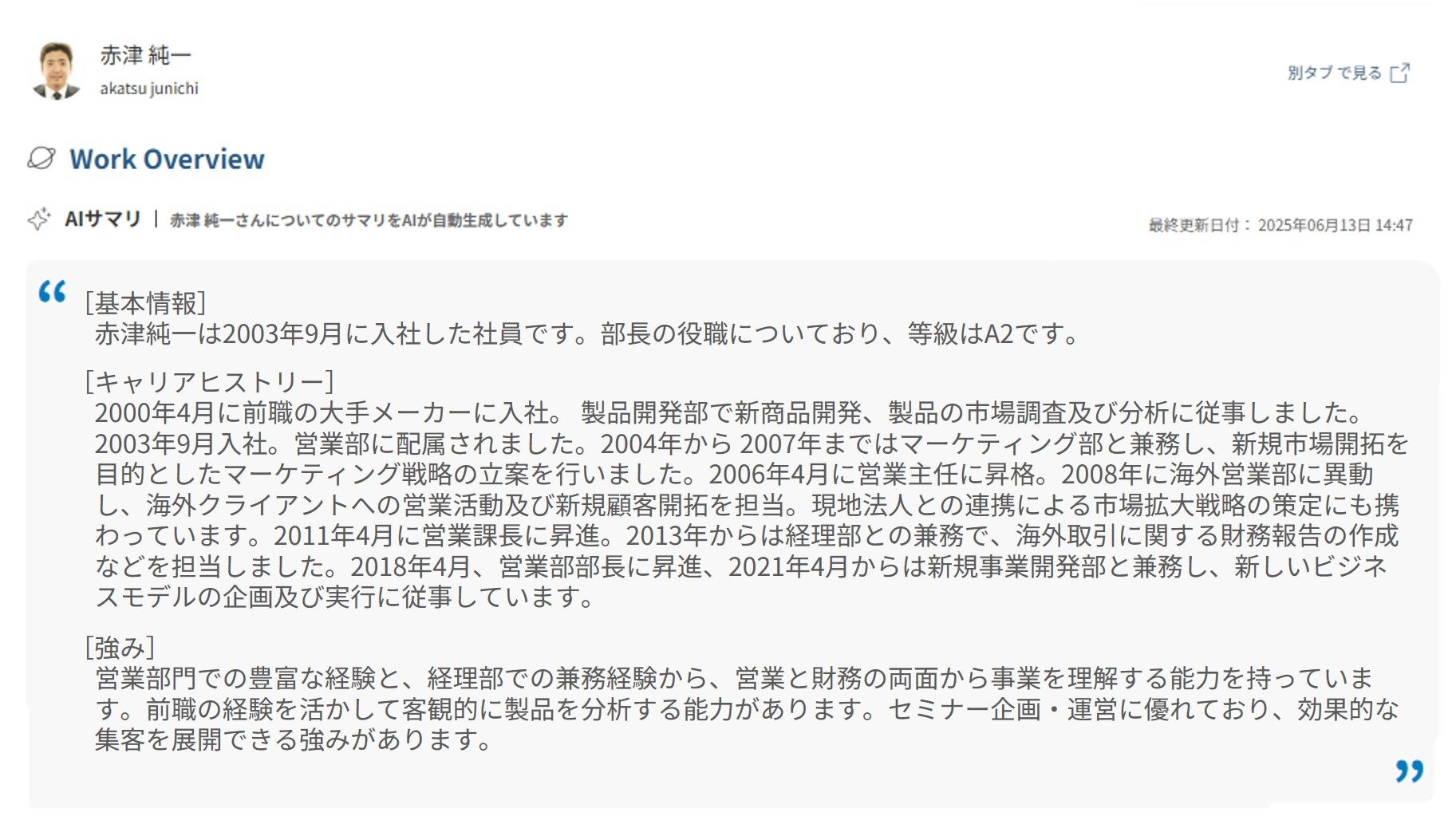 ▼生成AIを用いて従業員のスキル・キャリア・評価などを要約