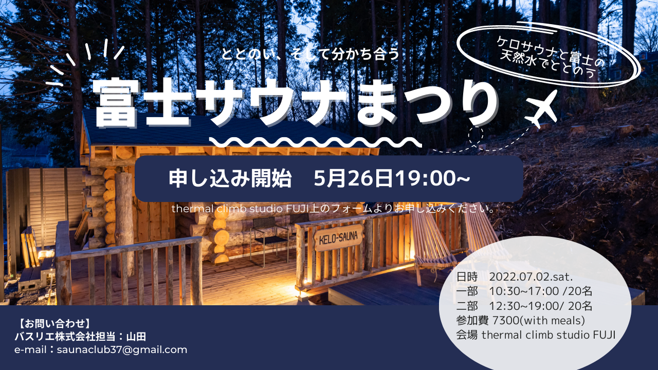 澄んだ山の空気と水風呂でまっさらな自分を取り戻しととのった時、思わず誰かと分かち合いたくなる『富士サウナまつり』を開催します!