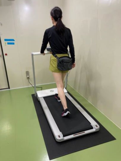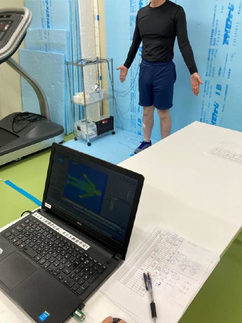前室にて20分以上安静にした後、猛暑環境へ移動し15分程度の早歩き(※2)による歩行運動を実施。運動終了後、再び前室に戻り40分間座位の状態で休憩を行う。この間の皮膚体温の温度を継続的に計測し、体温の変化を調べる。またサーモグラフィは運動前・運動直後・休憩後の3回撮影を実施する。