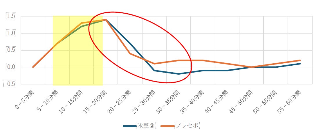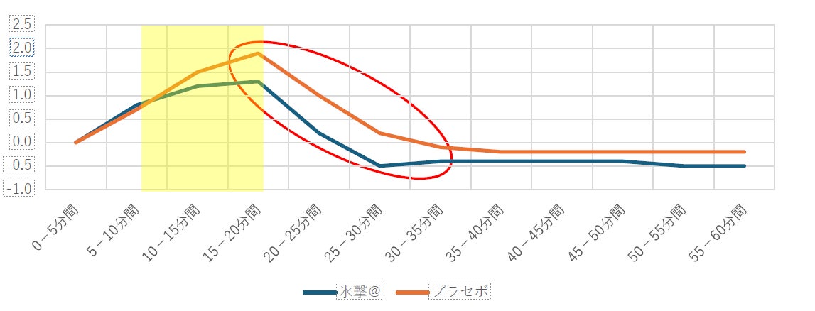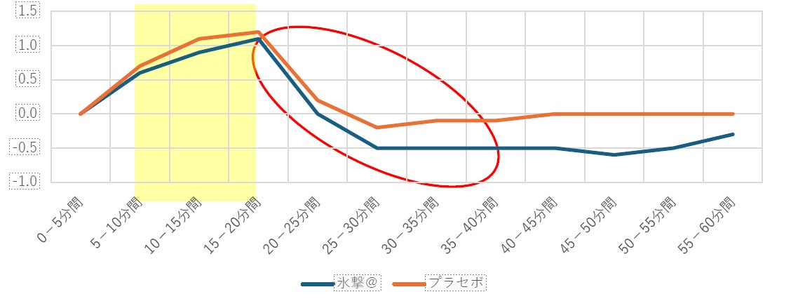 「氷撃α」の試験時の初期体温が高かったため、体温経過自体は高く表示されているが、運動終了直後にその差異がなくなるところまで体温は低下している。また運動中の体温上昇もプラセボと比較し抑えられており、また初期体温より低い状態が60分に渡り維持されている。