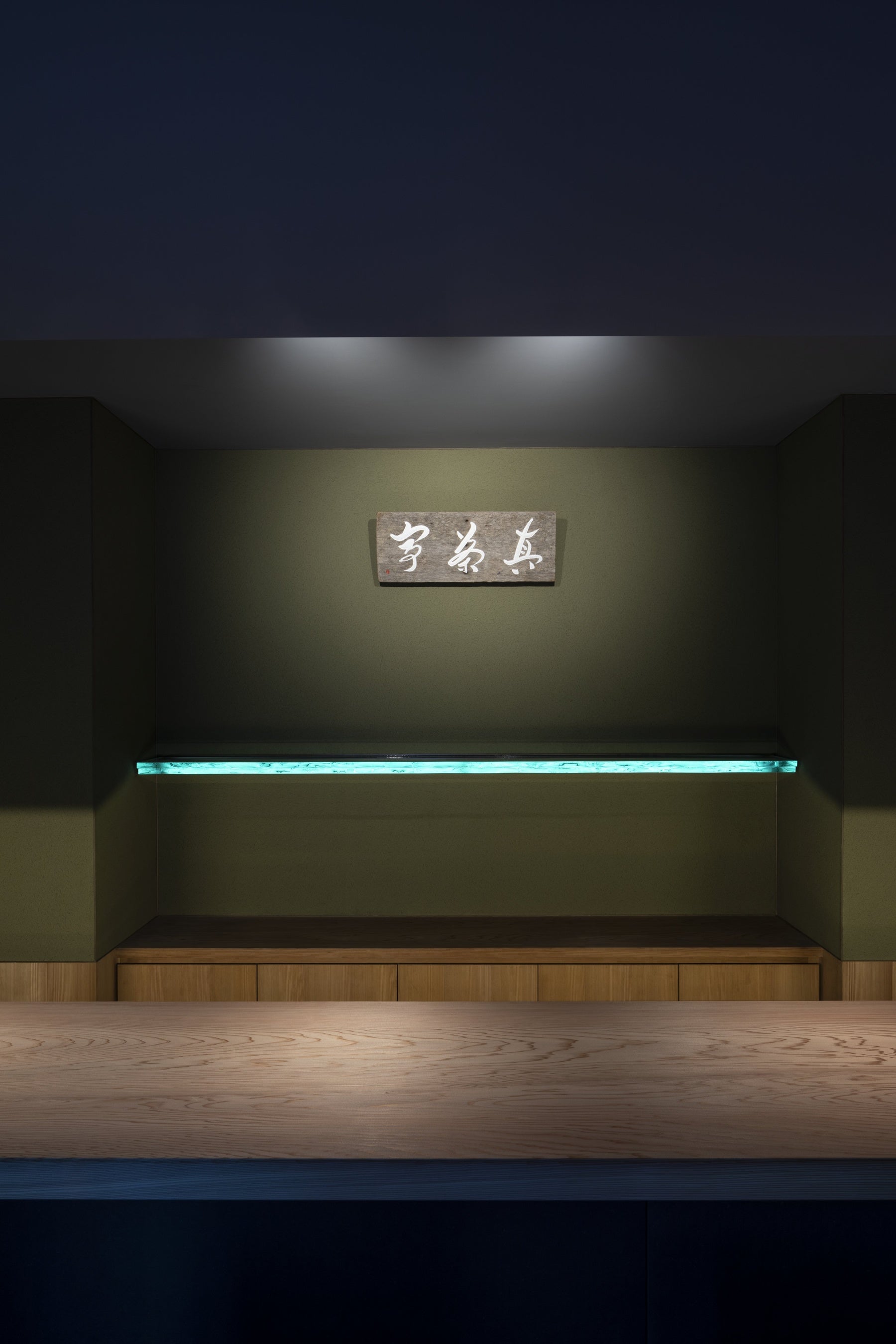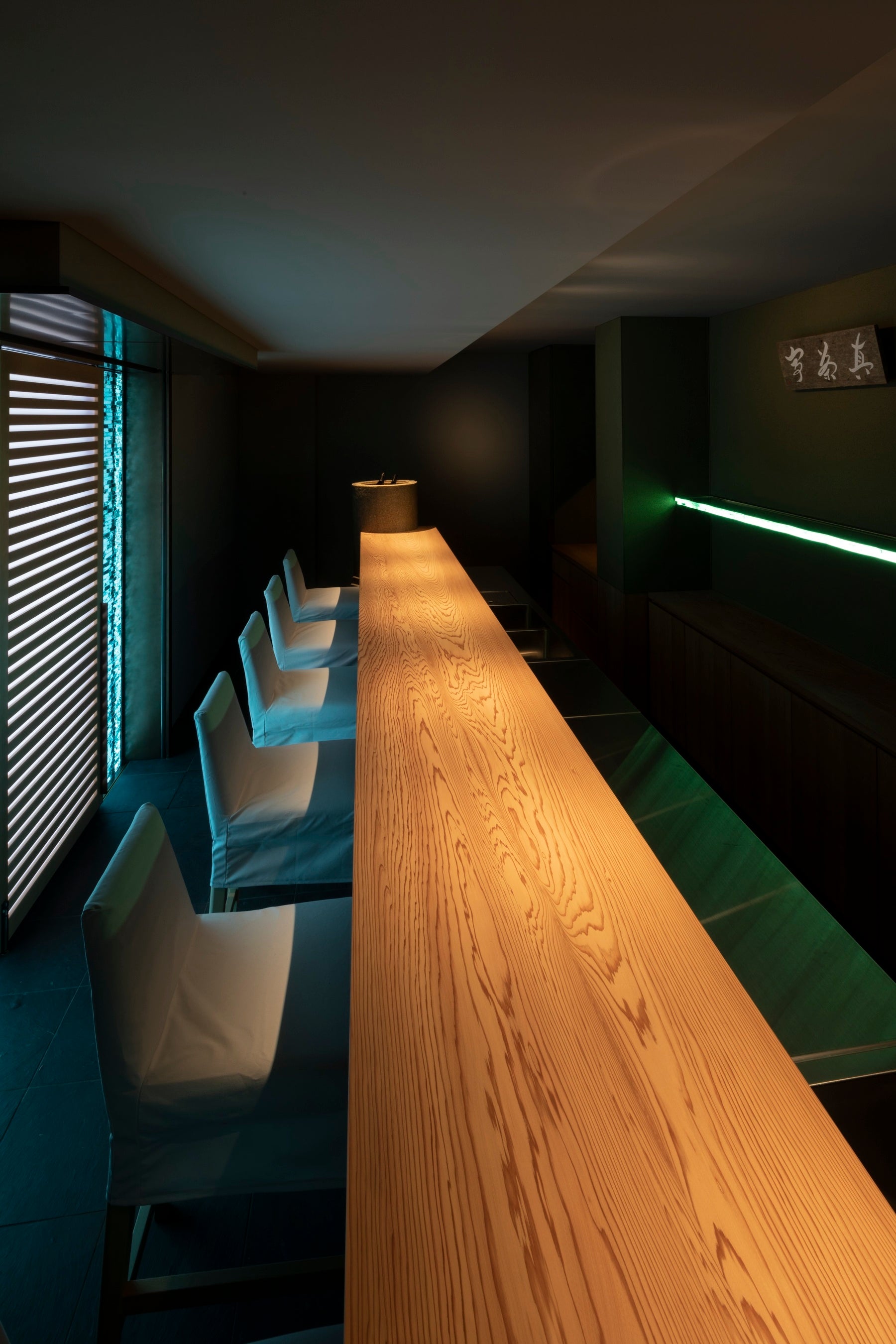 現代美術作家の杉本博司と建築家の榊田倫之が設計した隠れ家バー。木目を水の波紋の広がりに見立てた無垢の杉材を利用したカウンターや、職人が丁寧に表情をつけた美しい積層ガラスが印象的な空間。