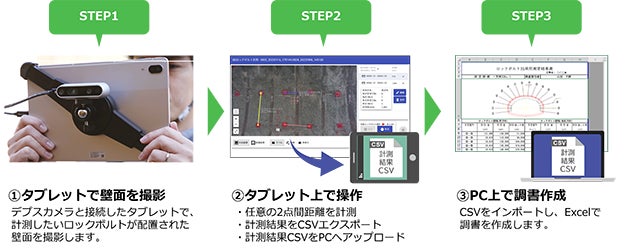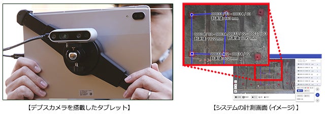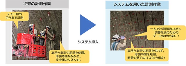 ロックボルトの配置間隔は、国土交通省や自治体などの出来形管理基準および規格に則った管理が必要であり、これまで煩雑で時間のかかる手作業で計測されてきました。本システムを利用すると、建設現場の施工管理者はデプスカメラ*2を搭載した汎用的なタブレットを用いて撮影するだけで、ロックボルトの配置間隔を画像上で計測できます。撮影されたロックボルトの画像データはトンネルの支保工*3情報と紐づけて整理して格納、計測結果はCSV形式で出力され、調書作成を支援します。本システムにより、従来は2人が手作業で行う計測作業を1人で行えるようになり、計測から調書作成までの延べ作業時間を2分の1に短縮することができます。さらに、高所作業車や足場などが不要になるため、安全性が大幅に向上するとともに、高度な技術を要さないため誰でも容易に計測できるようになり、建設業の人材不足解消に貢献します。