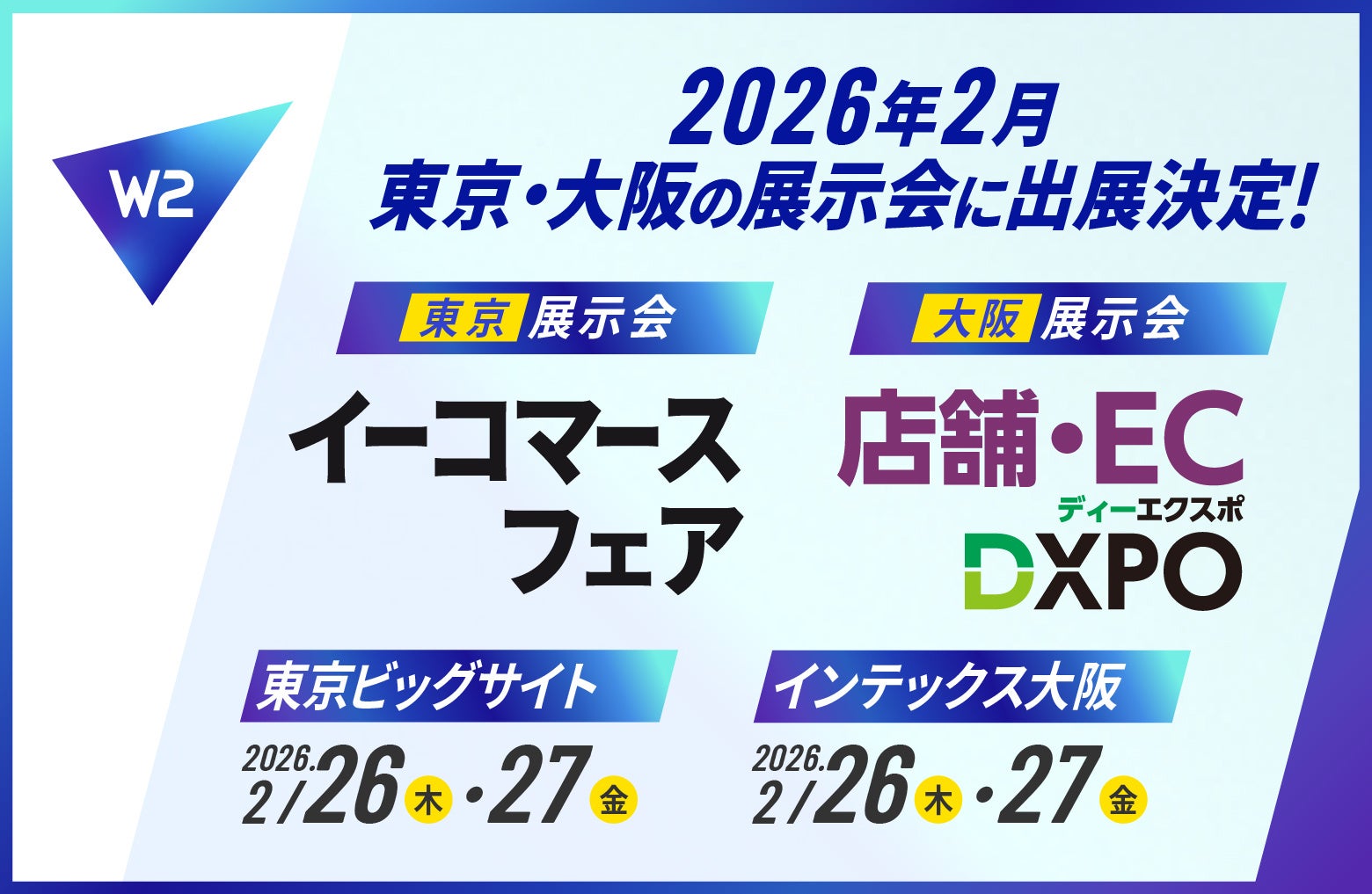 事業形態に合わせたコマースプラットフォームを展開するW2株式会社(本社:東京都中央区、代表取締役CEO:山田 大樹、以下W2)は、2026年2月に開催される 「第19回イーコマースフェア東京2026」 および 「第4回 店舗・EC DXPO大阪’26」 に出展いたします。