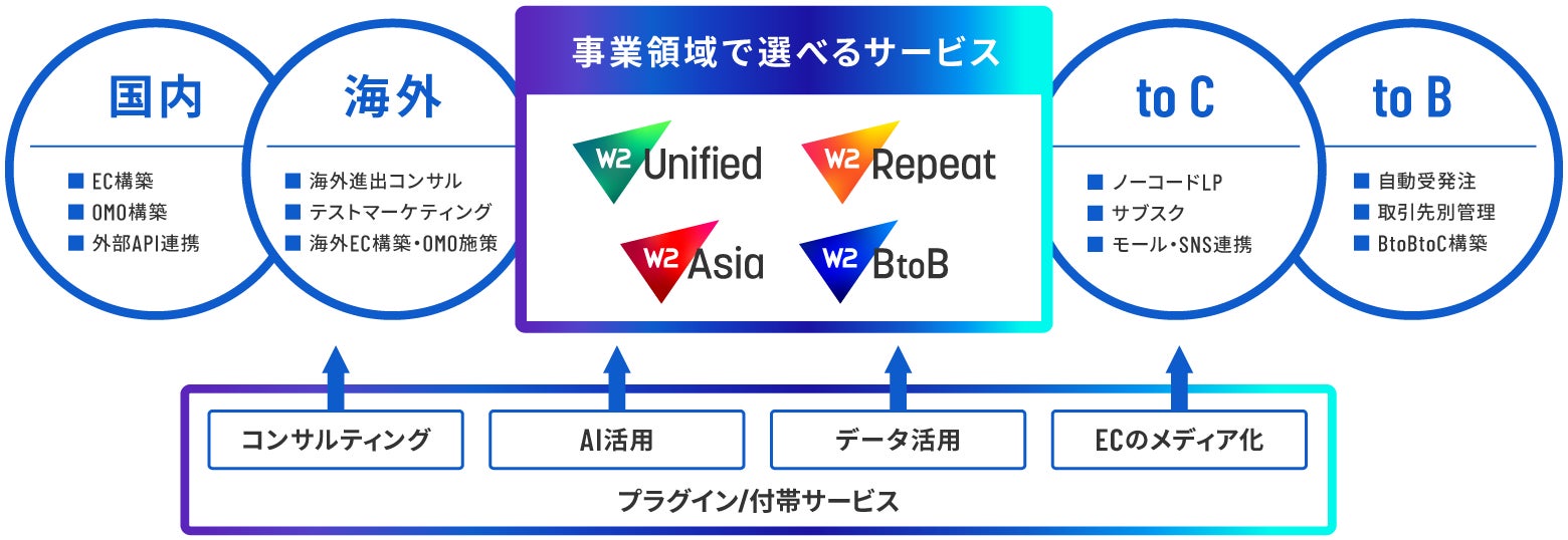 W2は、“事業領域で選べるECプラットフォーム”として、ビジネスの多様な成長ステージに対応する4つのソリューションを提供しています。