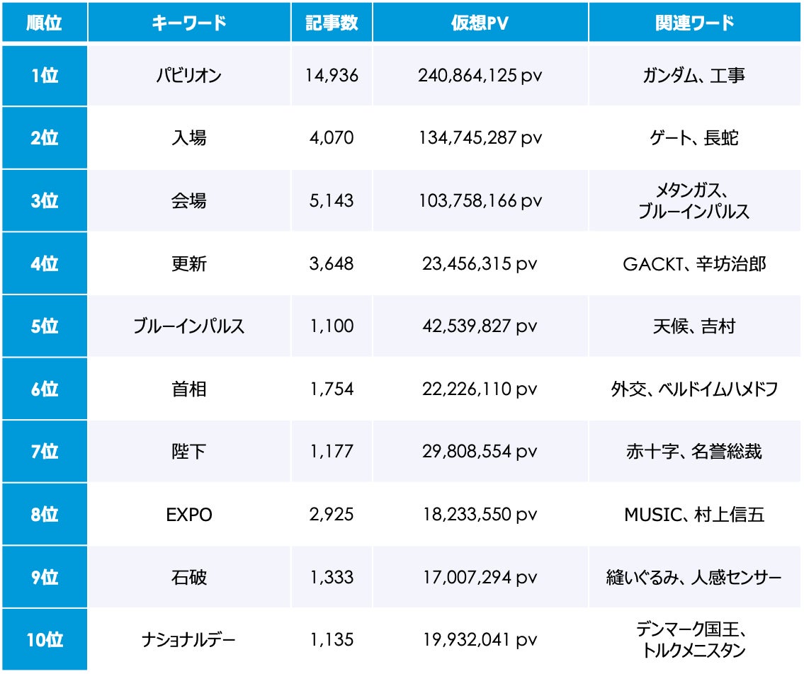 1位「パビリオン」のニュースで記事とPVが高いのがガンダムの話題。