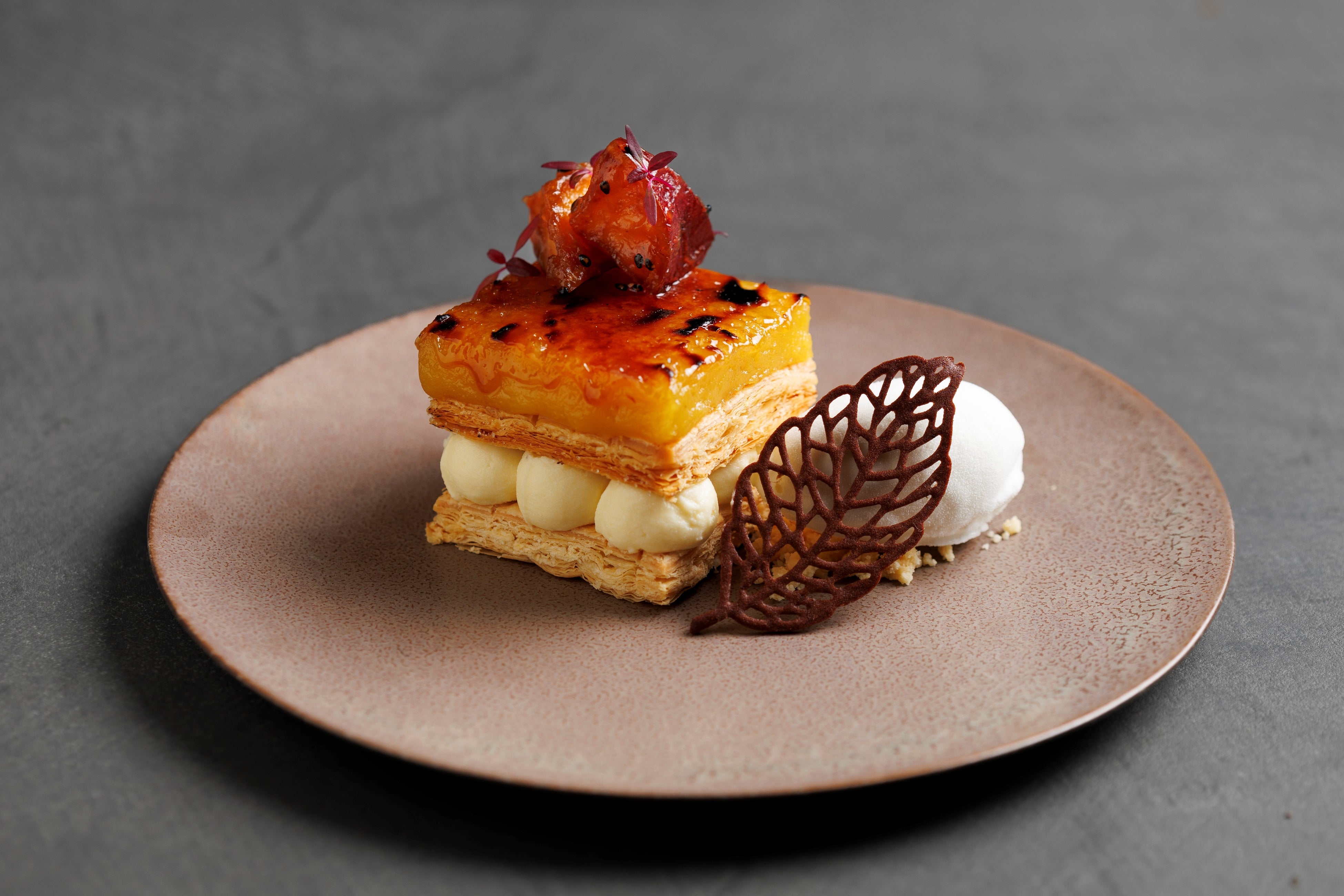 ブリュレ風に仕上げたスイートポテトと、濃厚なさつま芋ペーストにマスカルポーネを合わせたクリームをサクサクのパイ生地でサンド。自家製の美山牛乳ジェラートと共にお楽しみください。
