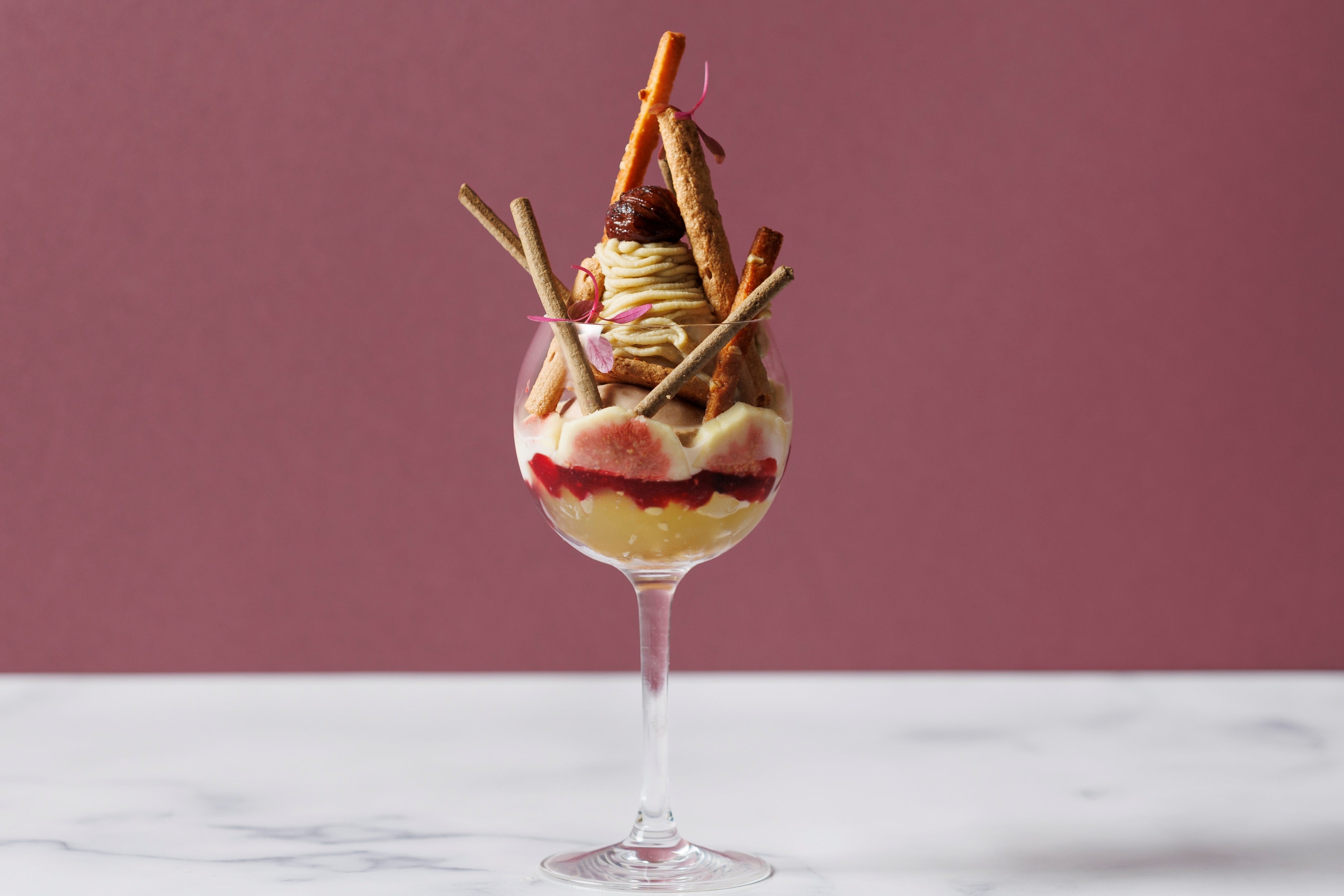 水面に浮かぶ花をイメージした季節の素材を楽しむグラススイーツ。栗とカシスのグラニテにほっくりとした和栗を散りばめた秋らしい一品。
