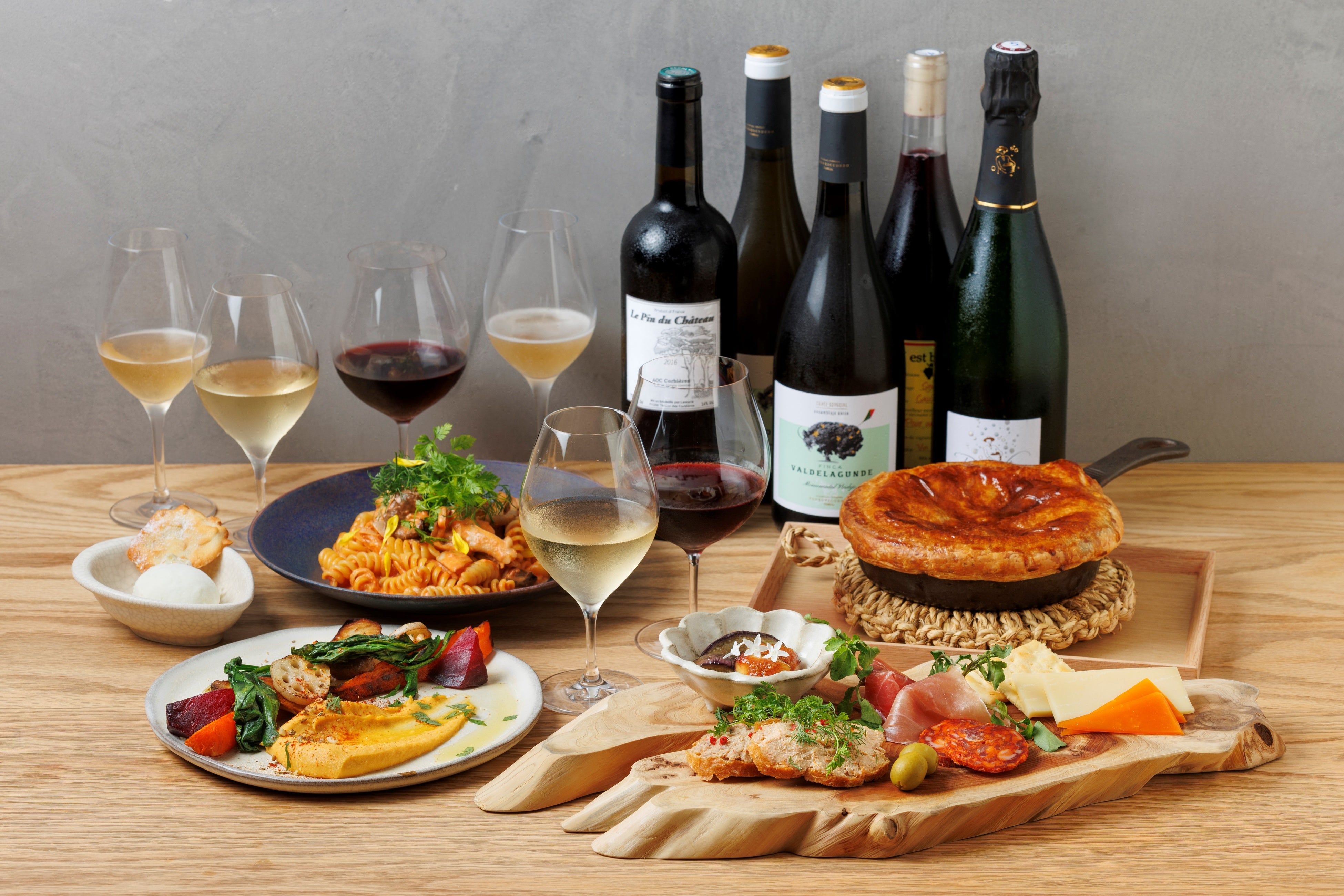 秋の夜長を中庭のテラス席で愉しめるプラン。ソムリエがセレクトしたワインをフリーフローで、全5種の料理やデザートと共に楽しめます。