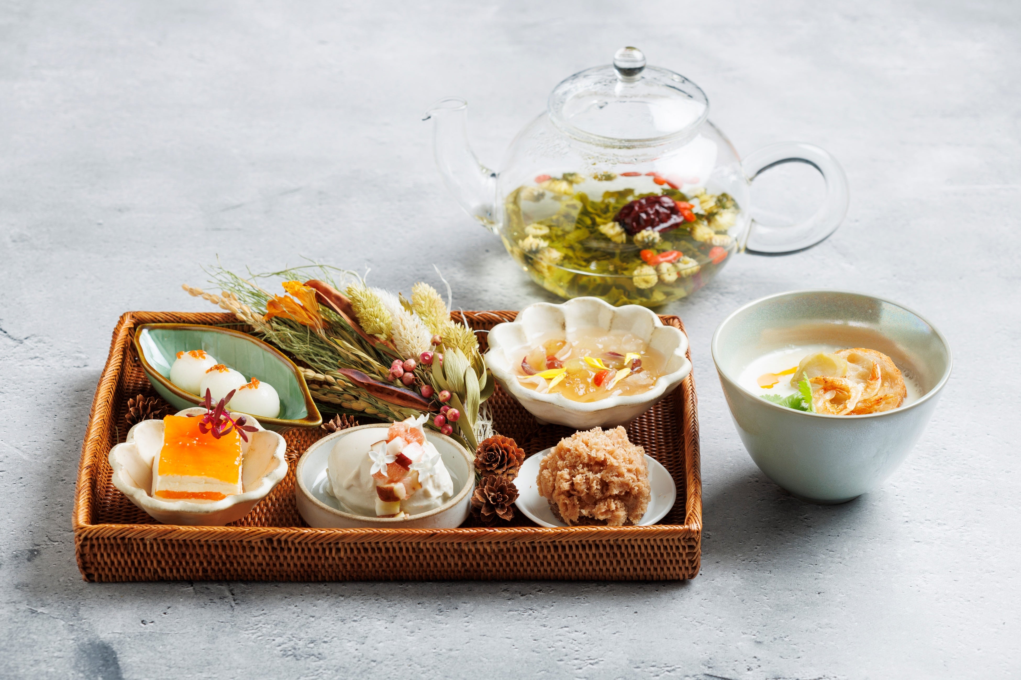 “食養生”をテーマにした食べやすいサイズのスイーツと、養生茶を一緒に楽しむことができるティーセット。体のバランスを崩しやすいこの季節にお召し上がりいただきたい一品です。