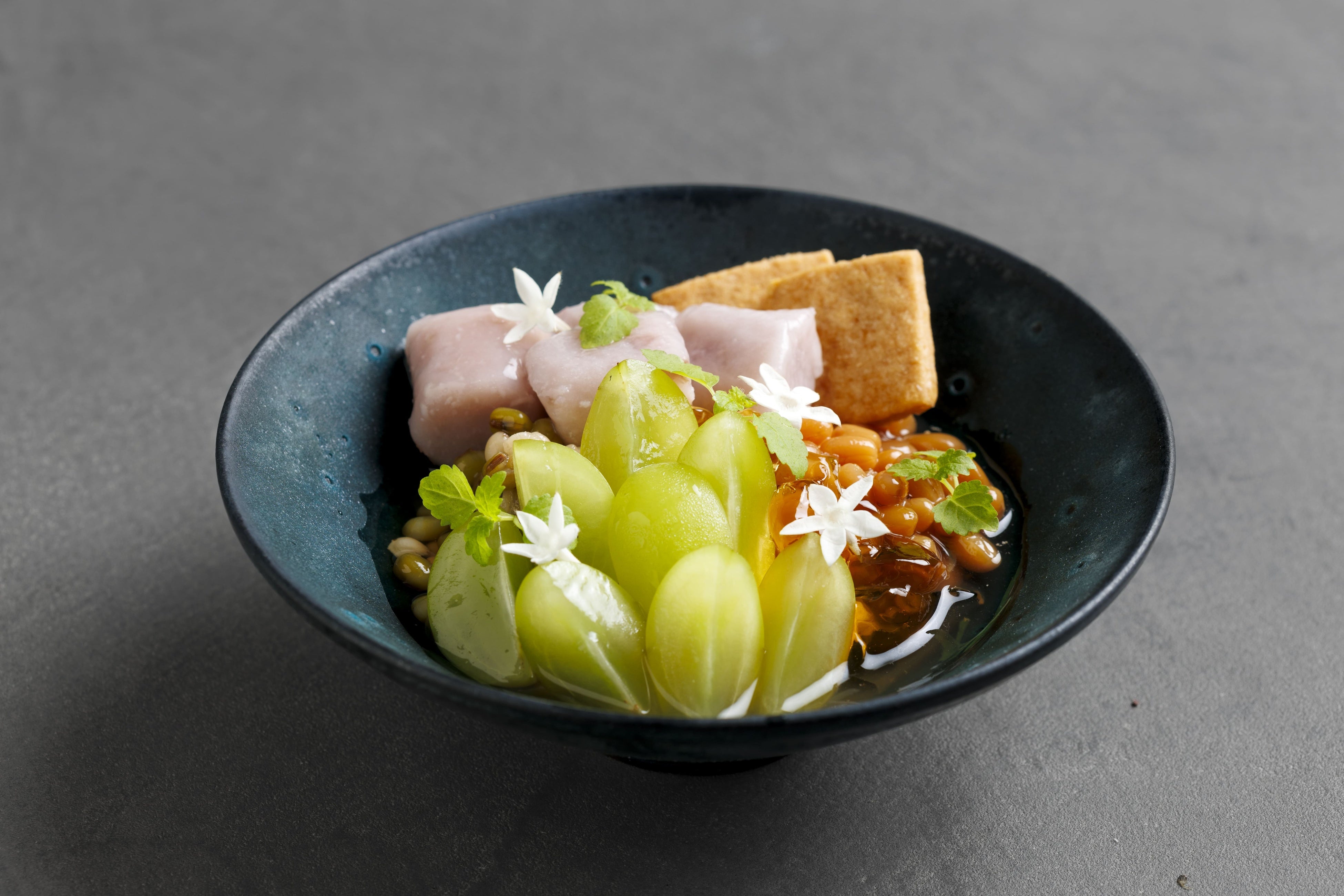 台湾スイーツ「豆花」をベースにしたオリジナルメニュー。社員マスカット、エルダーフラワーのジュレ、小豆、緑豆などをトッピング。