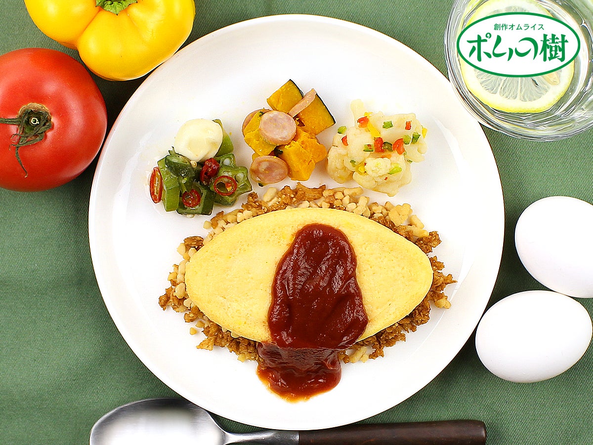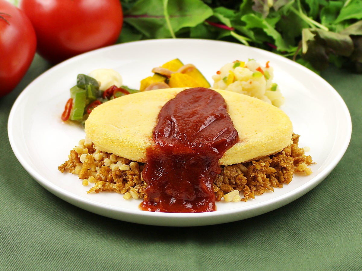 創作オムライス専門店「ポムの樹」監修プレートです。ポムの樹オリジナルのケチャップを使用し、ベーシックなオムライスに仕上げております。糖質を抑えるために、大豆を原料にしたそぼろをお米に見立てました。
