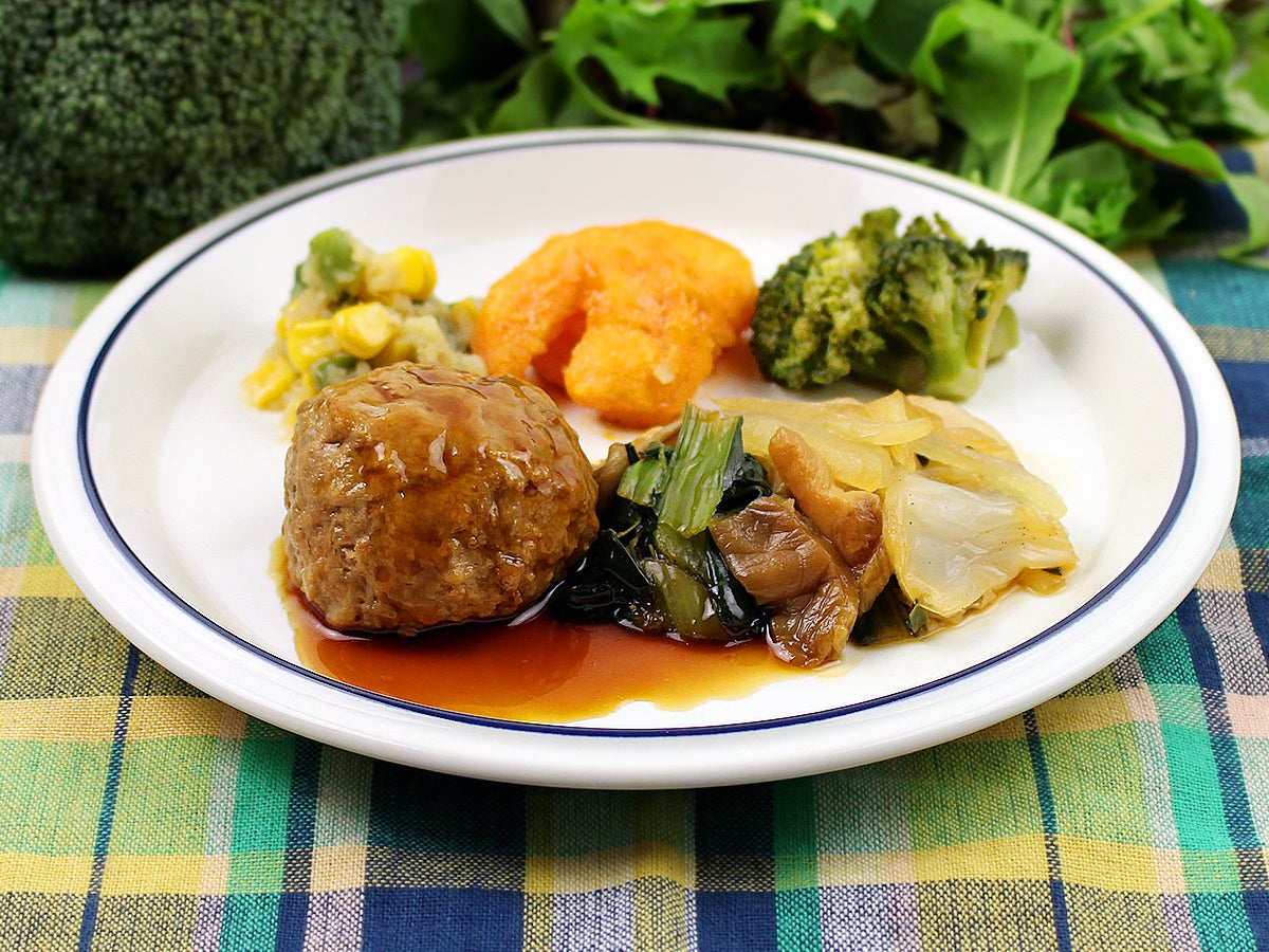 大ぶりでレンコンのシャキシャキ食感が特徴である鶏肉の肉団子と、たっぷりの添え野菜を甘酢あんでお召し上がりください。添え野菜には白菜、ほうれん草、玉ねぎ、ひらたけを使用しております。