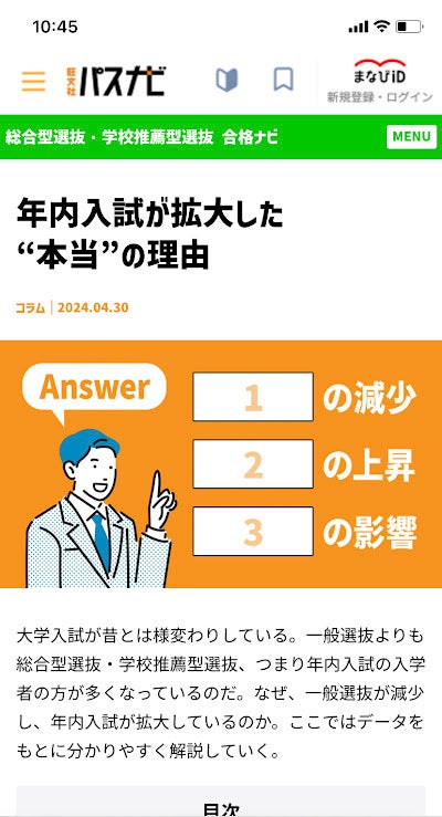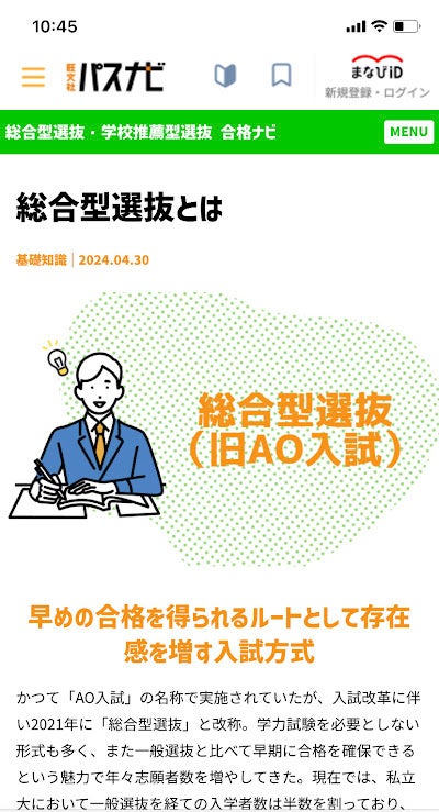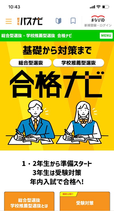 教育出版の株式会社旺文社(東京都新宿区、代表取締役社長 粂川秀樹)は、大学受験生をサポートするWebサービス「大学受験パスナビ」 にて、総合型選抜・学校推薦型選抜を基礎から対策まで徹底サポートするサイト「総合型選抜・学校推薦型選抜 合格ナビ」を、4月30日(火)より公開しました。公開時には、「総合型選抜とは?」/「学校推薦型選抜とは?」といった基礎知識や「年内入試が拡大した“本当”の理由」コラムを掲載。今後、「志望理由書の書き方」や「小論文・面接対策」、「過去問」といった受験対策や実際に合格した先輩たちによる「面接実態レポート」などを順次掲載していきます。