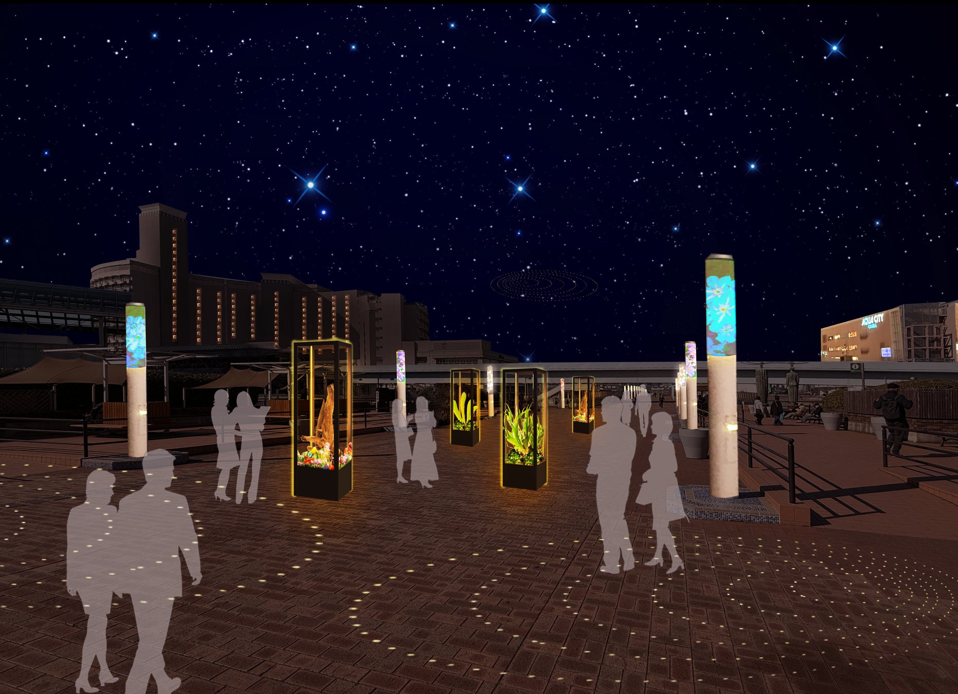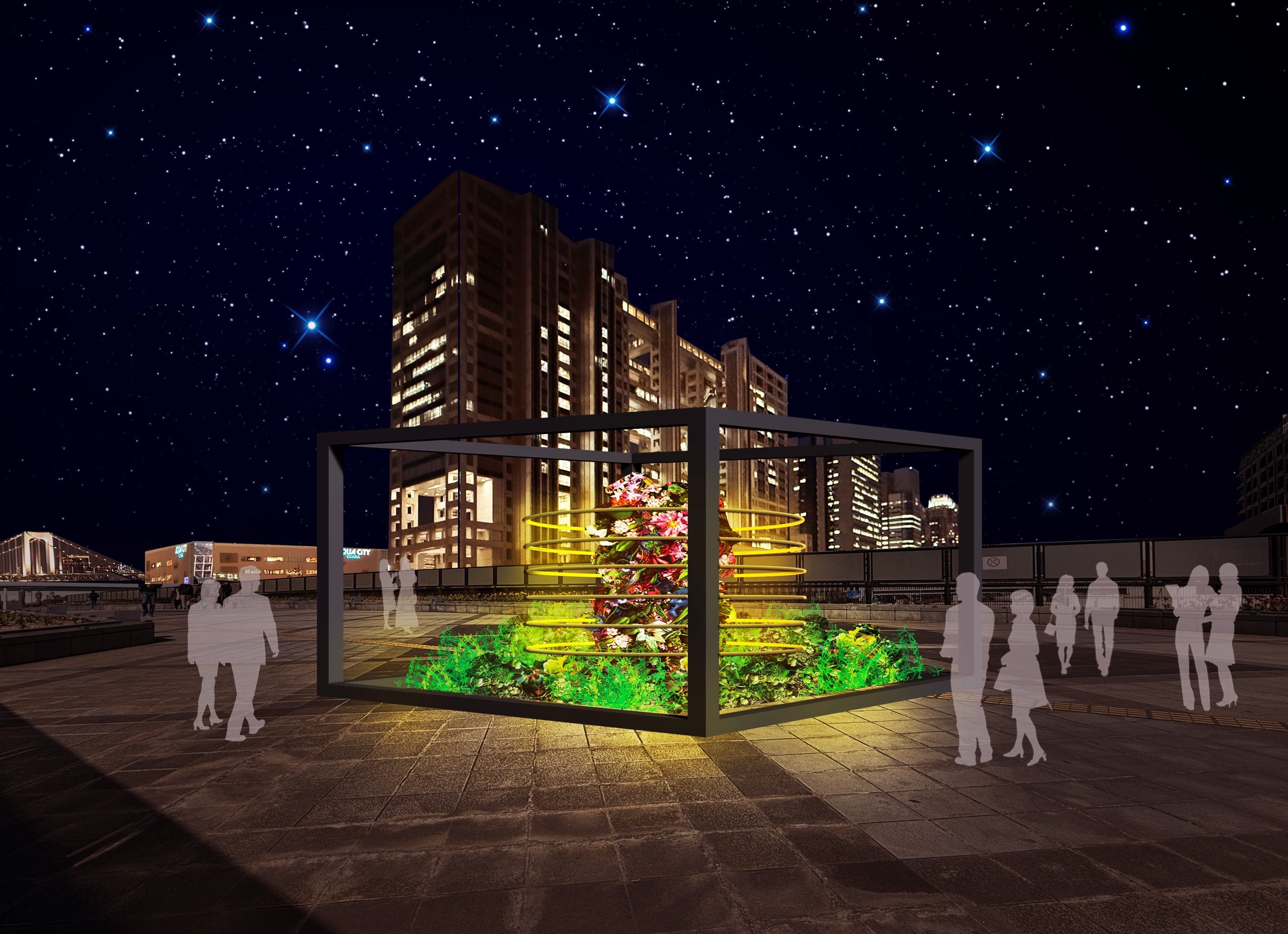 植物などを使用した昼も夜も楽しめる光のオブジェを、東京アクアシンフォニーからセントラル広場までのウエストプロムナード上に順次設置します。都心の春に幻想的な空間を展開します。