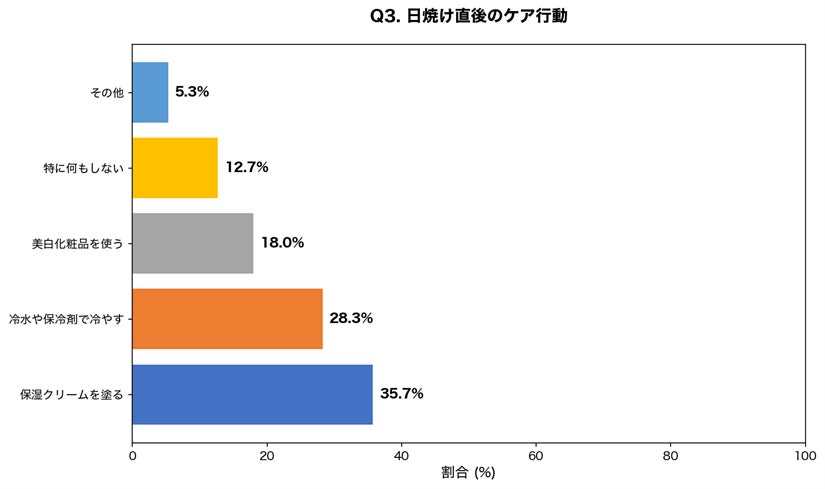 日焼け直後の正しい対応である「冷却」を選んだ人は28.3%にとどまりました。最も多かったのは「保湿クリームを塗る」の35.7%ですが、炎症が強い状態での保湿剤使用は刺激になる可能性があります。まず冷却で炎症を抑え、その後に保湿を行うという正しい順序の認知が不足しています。