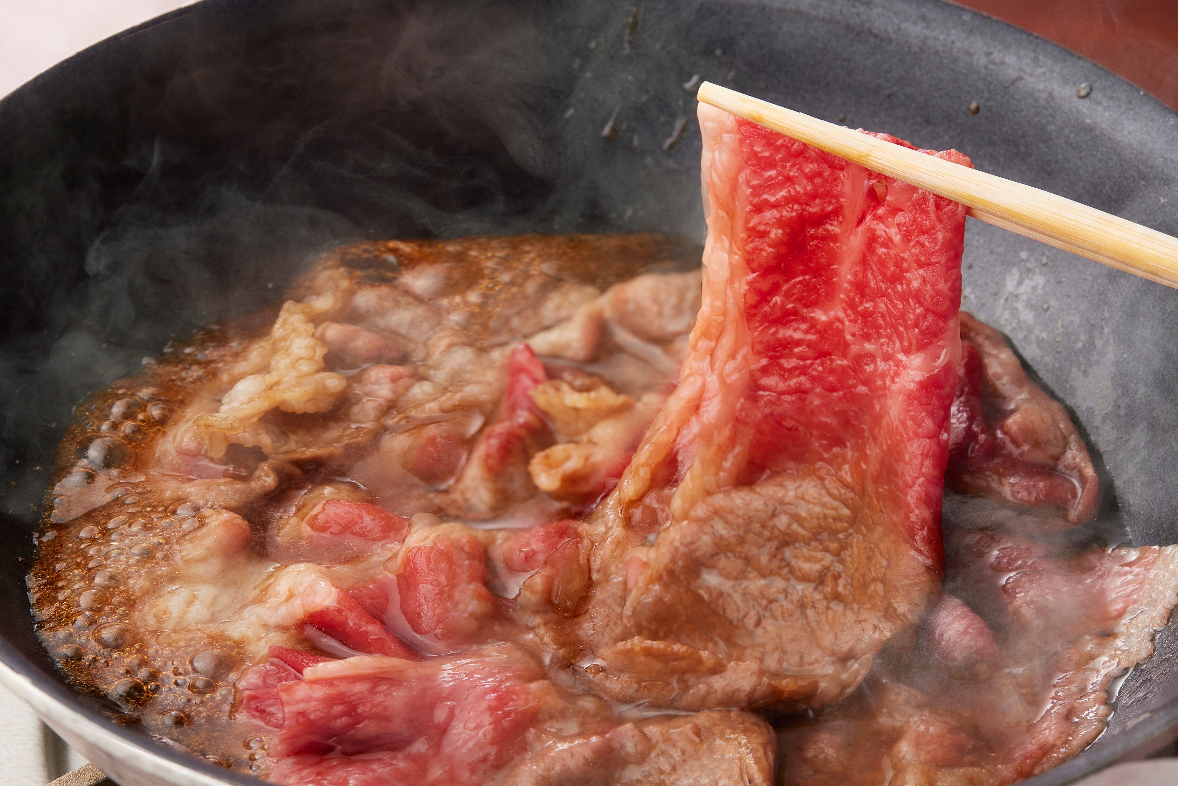 「第12回全国和牛能力共進会鹿児島大会」にて日本一に輝いた鹿児島黒牛を丸亀製麺でも人気のすき焼き仕立てに。お肉自体にしっかり甘みがあるため、味付けは割り下のみ。素材の良さを最大限に引き出すために砂糖をつかわず、肉の脂の甘みをそのまま生かす「あえてひと手間いれない」のもこだわりのひとつ。