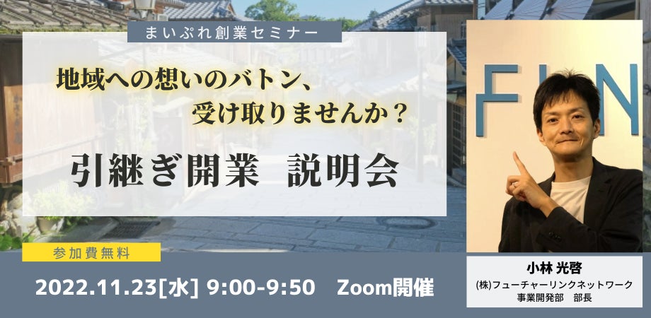 全国704市区町村をカバーする地域情報サイト「まいぷれ」を運営する株式会社フューチャーリンクネットワーク(本社:千葉県船橋市、代表取締役:石井丈晴)は、2022年11月23日に地域の想いとつながりを生かして新規開業を行う人を支援する『引継ぎ開業説明会』を開催します。