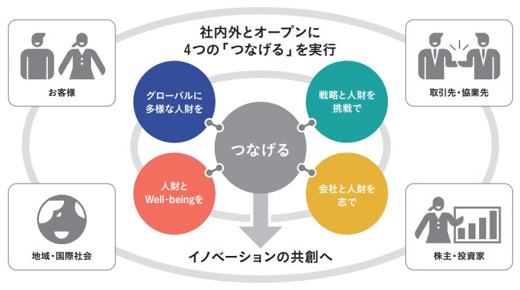 そして、当社の目指す、ありたい姿の実現に向けて「多様性」「挑戦」「Well-being」「志」の4つの軸と「つなげる」というキーワードの下、人財戦略を実行しています。