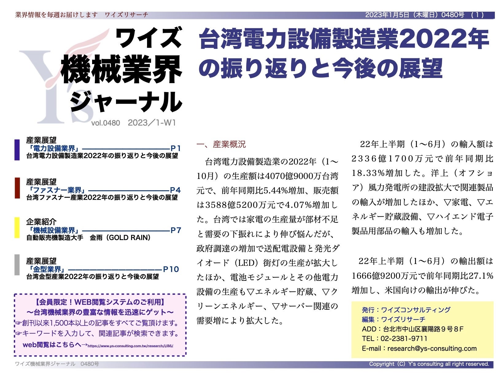 【台湾情報】台湾電力設備製造業2022年の振り返りと今後の展望<ワイズ機械業界ジャーナル2023年1月第1週号発行>