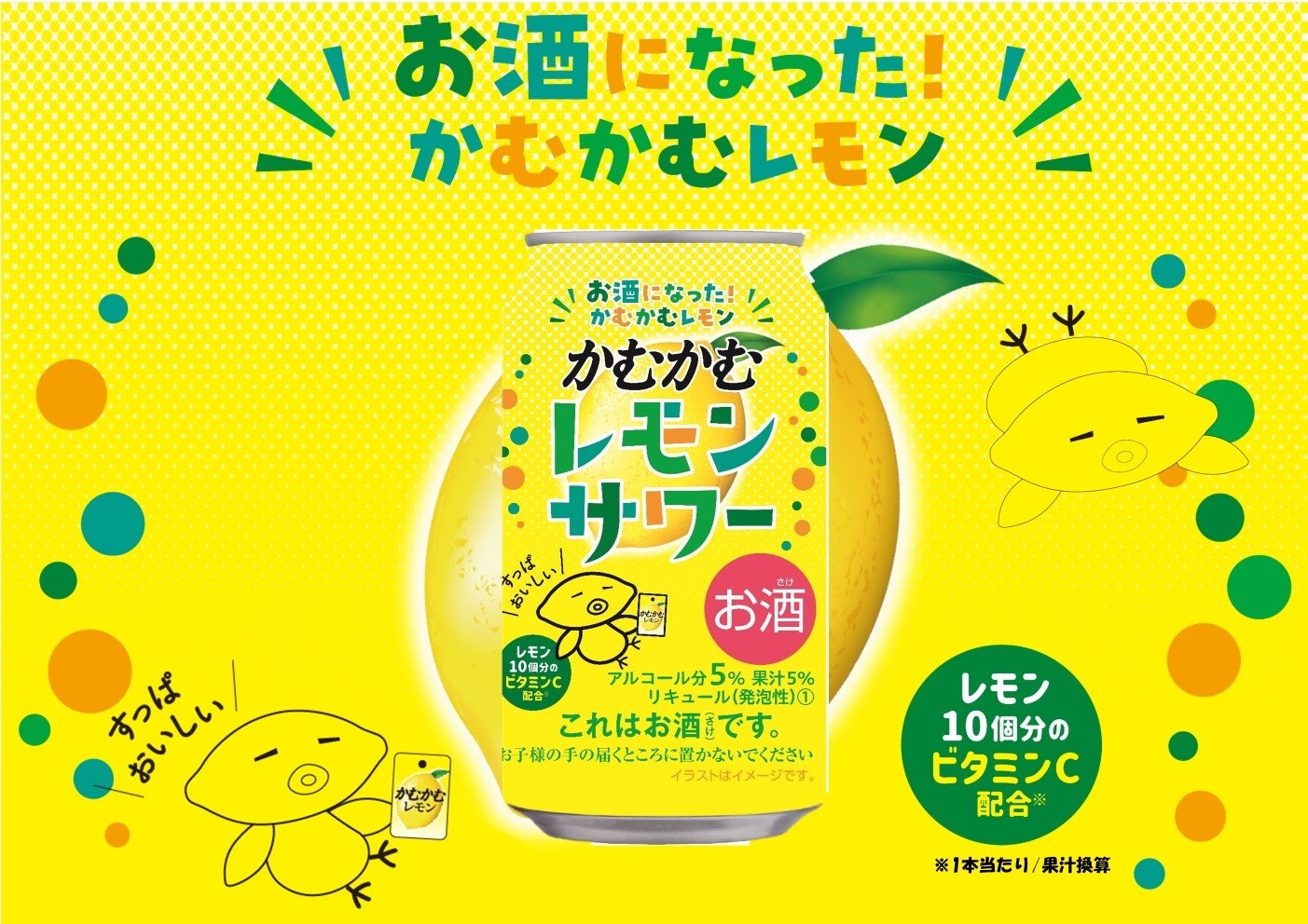 この度、約3年ぶりにかむかむレモンサワーを期間限定で再発売いたします。前回発売時より更にかむかむレモンに近づけるべく、甘さやすっぱさなど味わいをリニューアル。程よい甘さとすっぱ風味が楽しめます。またかむかむレモン同様(※)、レモン10個分のビタミンCを配合しております。(1本あたり/果汁換算)パッケージには、かむかむシリーズのメインキャラクター「かむぴよ」がかむかむレモンを持って登場。