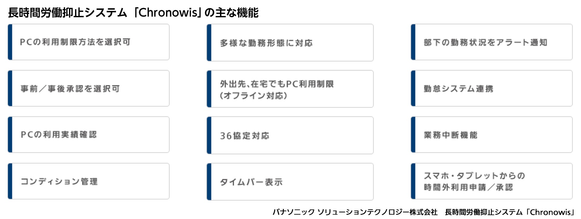 パナソニック ソリューションテクノロジー株式会社(本社:東京都、代表取締役社長:伊藤 一義)は、2026年2月、長時間労働抑止システム「Chronowis(クロノウィズ)」のバージョンアップを実施します。