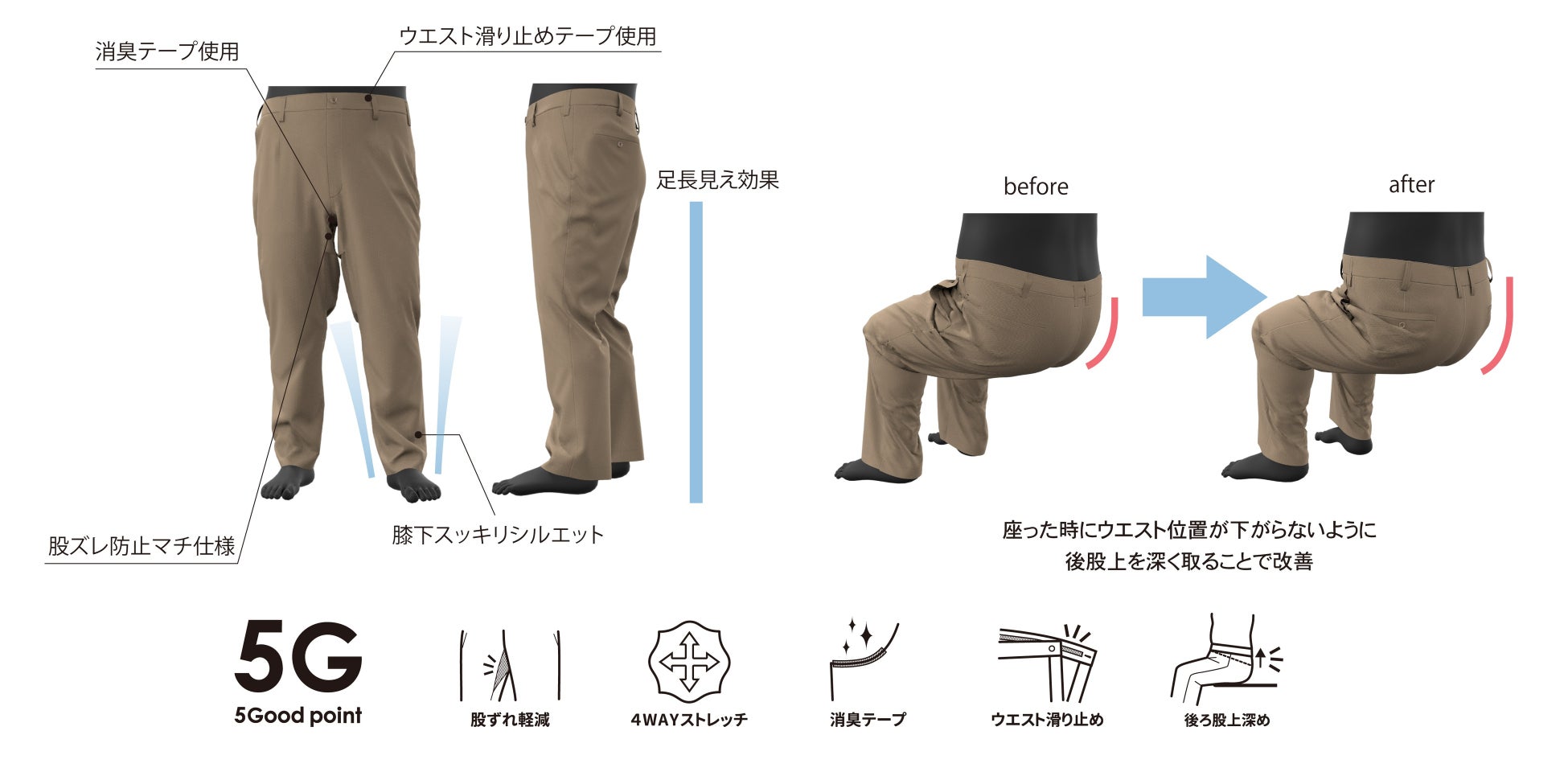 座った時のことを考え、インナーなどが見えにくいよう後股上を深めにすることで安心してご着用いただけます。