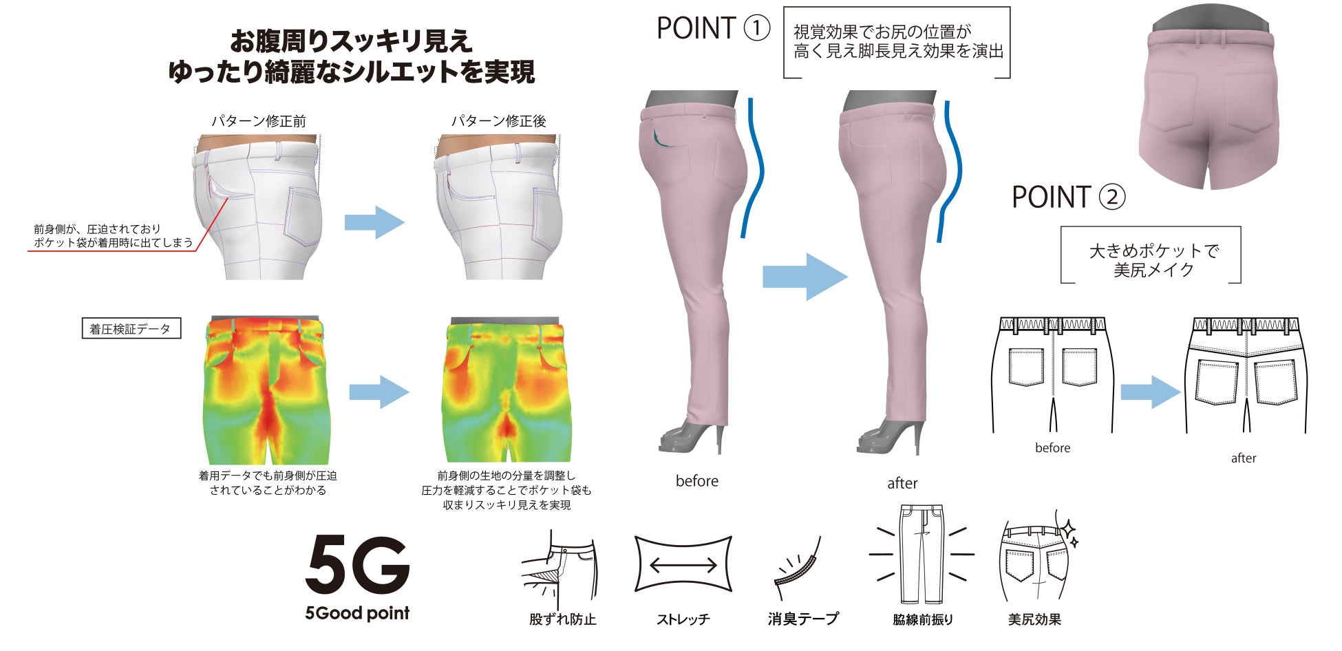 後ろポケットのサイズを大きくし、中心へ近付けることでヒップ周りが広がって見えないようなパターンを採用。視覚的なヒップアップを目指しました。