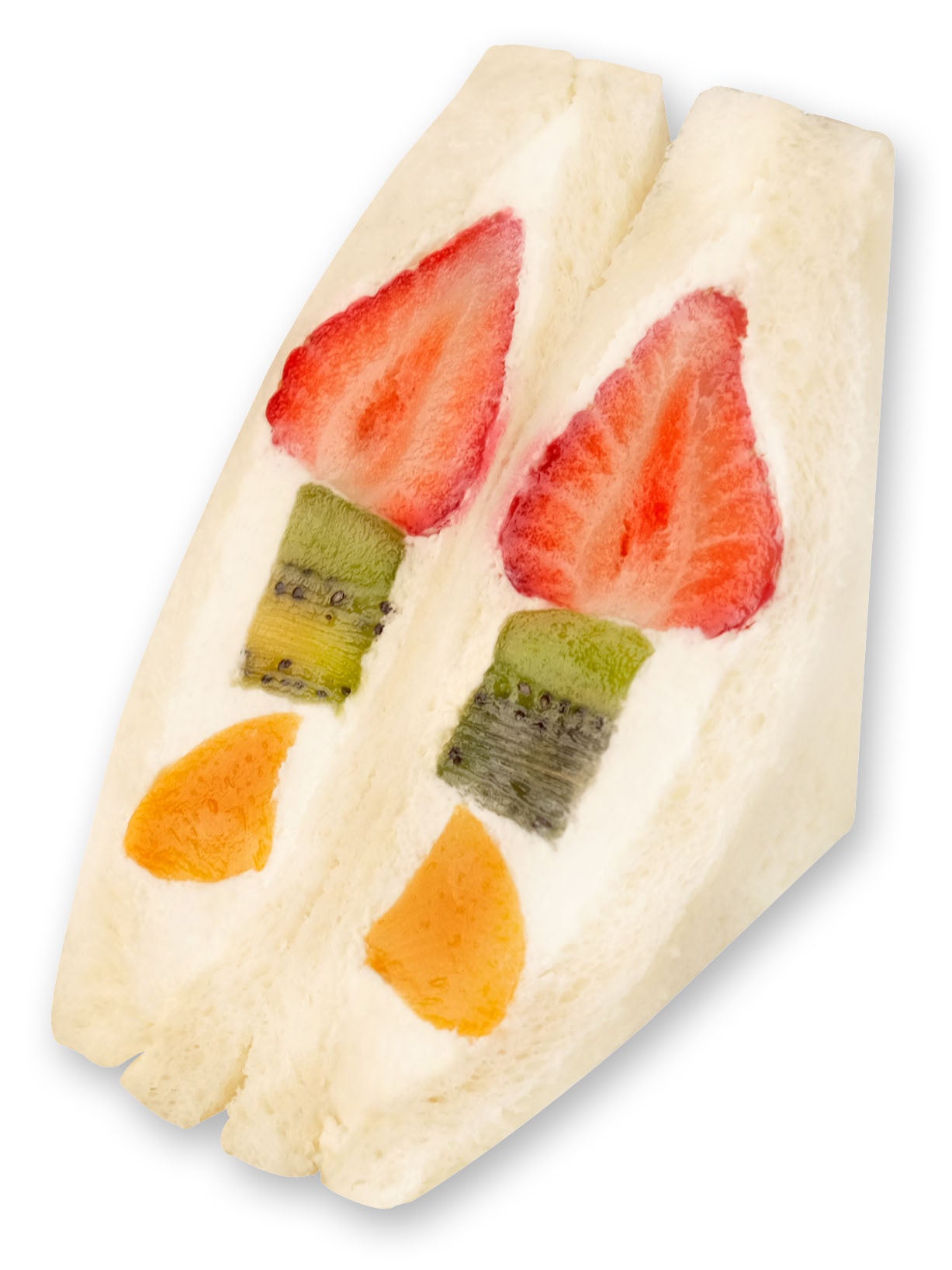 定番商品として年中揃えられるフルーツを挟みました。黄桃は、コクと甘みが強いのでいちごよりも酸味の強いキウイフルーツを一緒に挟むことでバランスの良い組み合わせに仕上げました。