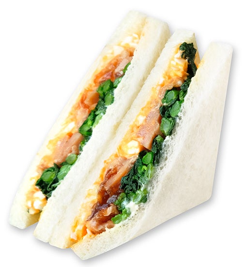 ほろ苦い菜の花と、照り焼きチキン、まろやかなたまごサラダを合わせた、春らしい彩りのサンドイッチ。照り焼きチキンのコク深い味わいに、菜の花のほのかな苦みがアクセントを添え、たまごサラダのやさしい甘みが全体を包み込みます。ふんわりとしたパンとともに、季節の移ろいを感じられる一品です。