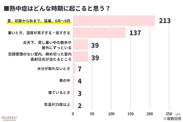 - 熱中症が起こる時期は「夏」や「6~9月」と思う飼い主さんが213人で最多!