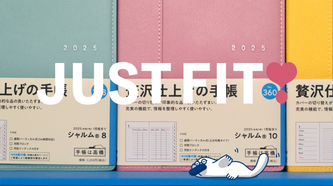今年のテレビCMは、「JUST FIT」をテーマに制作しました。ふつうは、みんな、違うから。どんな生き方にもフィットするように、296種類を揃えた今年の手帳。「手帳は高橋」のキャラクターのたかもんが、「♪こだわりのビジネス手帳」「♪贅沢仕上げの手帳」と歌にのせて次々と紹介していきます。ぜひ、あなたにぴったりJUST FIT!する手帳を見つけてください。