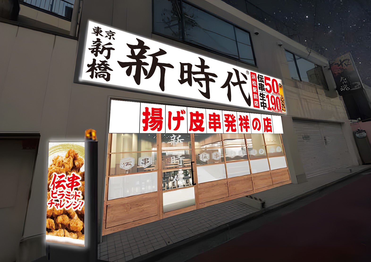 新時代は「揚げ皮串発祥」のお店であり、名物の『伝串』は、特許庁から認められる唯一無二の大ヒット商品です。並んででも「伝串」を体験されたいというお客様が多く、連日行列ができる大人気の居酒屋です。1000の街を元気にするため、全国の街を一つずつ元気にしており、今回はついに浜松初上陸。静岡・浜松から静岡だけでなく東海地方全体を元気にします。オープン前から大行列ができること間違いなしです。