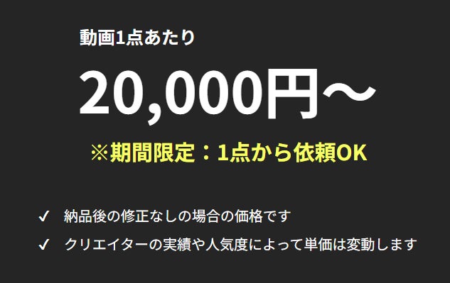 制作単価は動画1点あたり20,000円からとなります。現在、期間限定で1点から制作依頼が可能です。