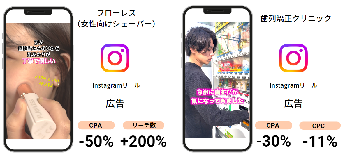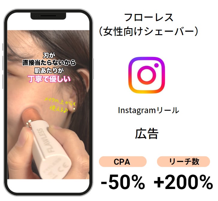 実際にTATE-PROを通じてInstagram広告の動画施策にトライした企業では、静止画のみでの配信時と比べ、CPAが-50%低下・リーチ数が3倍に増加するなど、広告成果の向上につながりました。