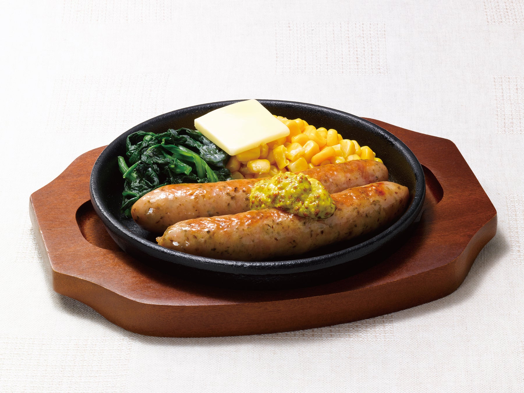 粗挽きソーセージに、ほうれん草・コーン・バターを盛り合わせました。粗挽きソーセージはパリッと噛むほどに旨みが広がります。