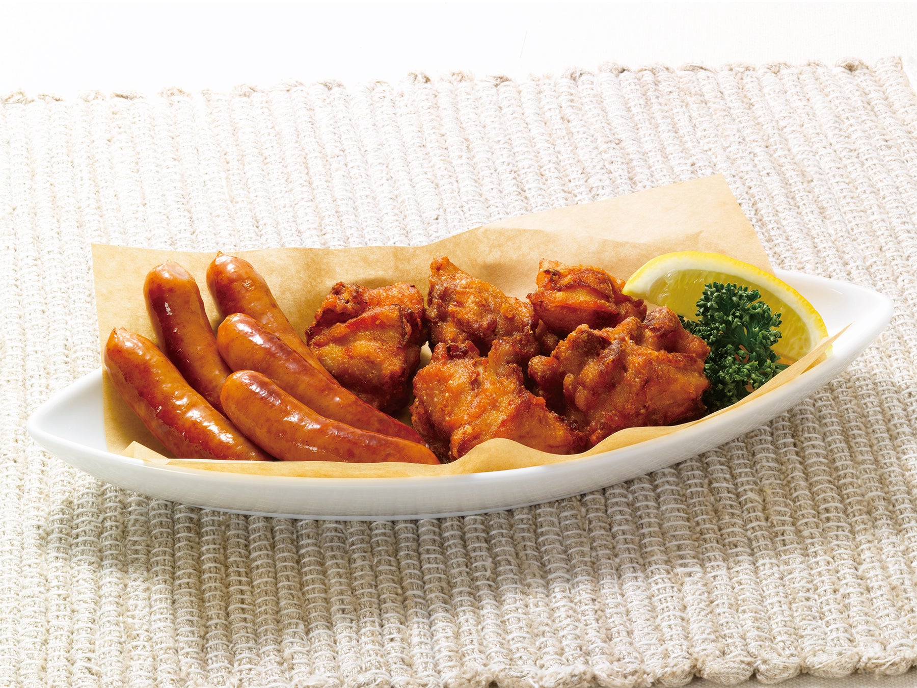 手作りフライドチキンとパリッとした食感の粗挽きソーセージを盛り合わせました。