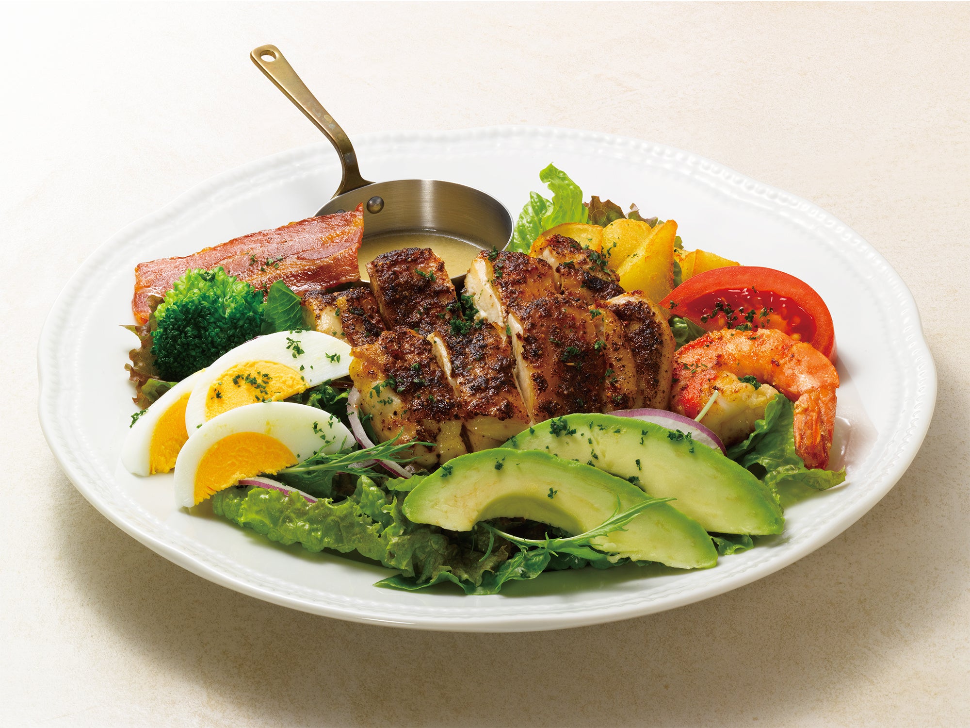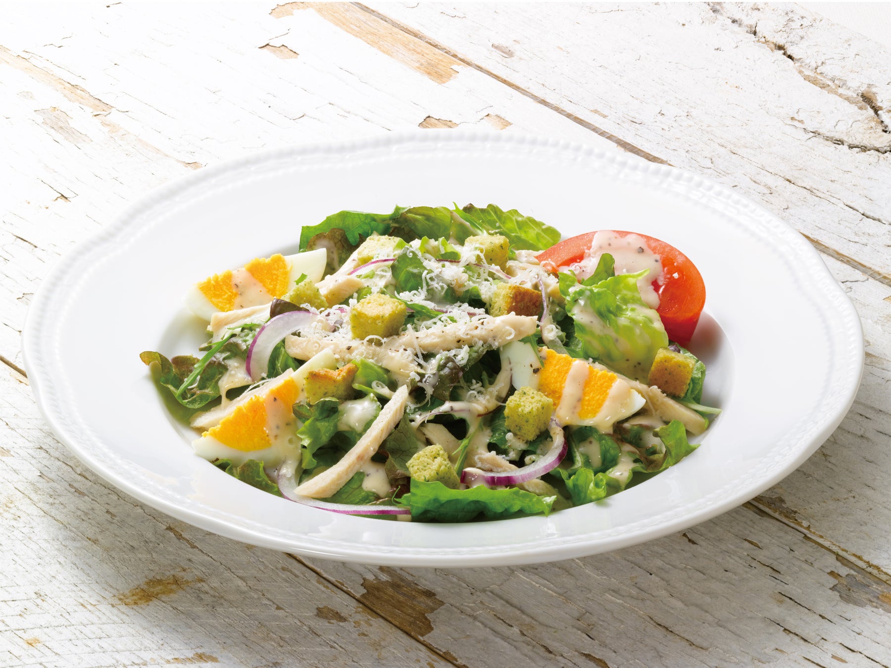 葉野菜に蒸し鶏、ゆで卵、トマトを彩り良く盛り付けて自社製のシーザードレッシングをかけました。ハーブが香るクルトンの食感がアクセントです。
