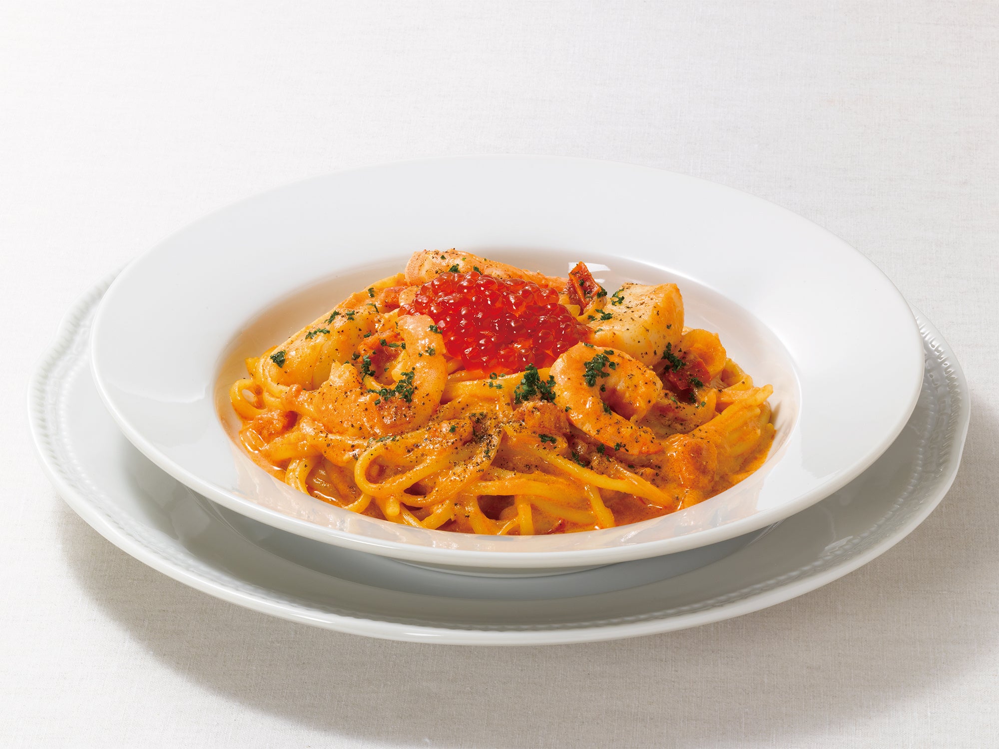 少し酸味のあるトマトクリームソースのスパゲティにボイル海老、帆立を合わせ、いくらをトッピングしました。トマトクリームソースに上品ないくらの旨みが良く合います。