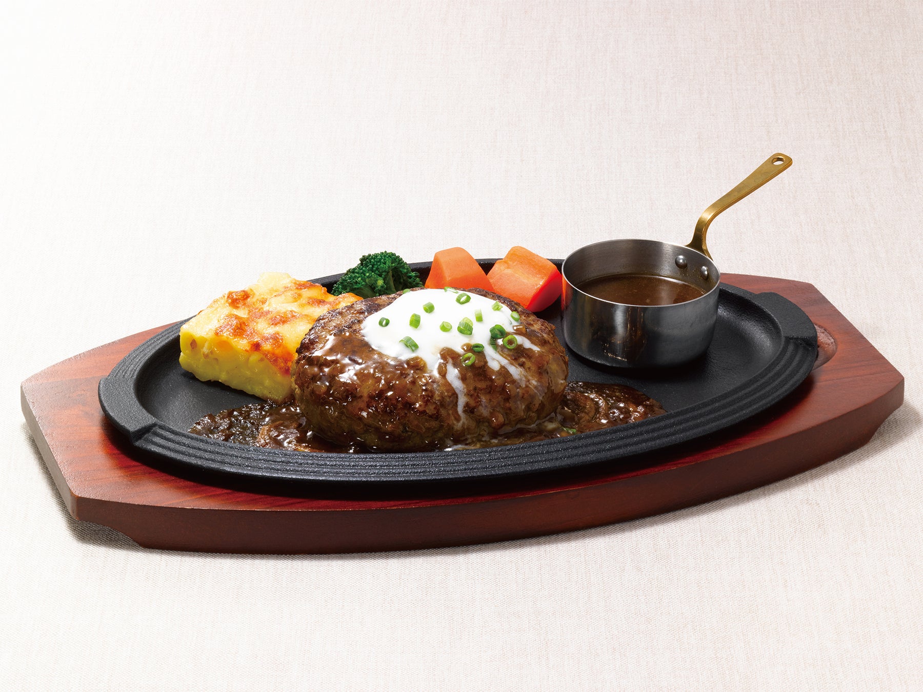 国産の黒毛和牛と黒豚をロイヤルホストの黄金比で配合した人気のハンバーグです。肉汁あふれるハンバーグと付け合わせの自社製ペンネグラタンが相性ぴったりです。