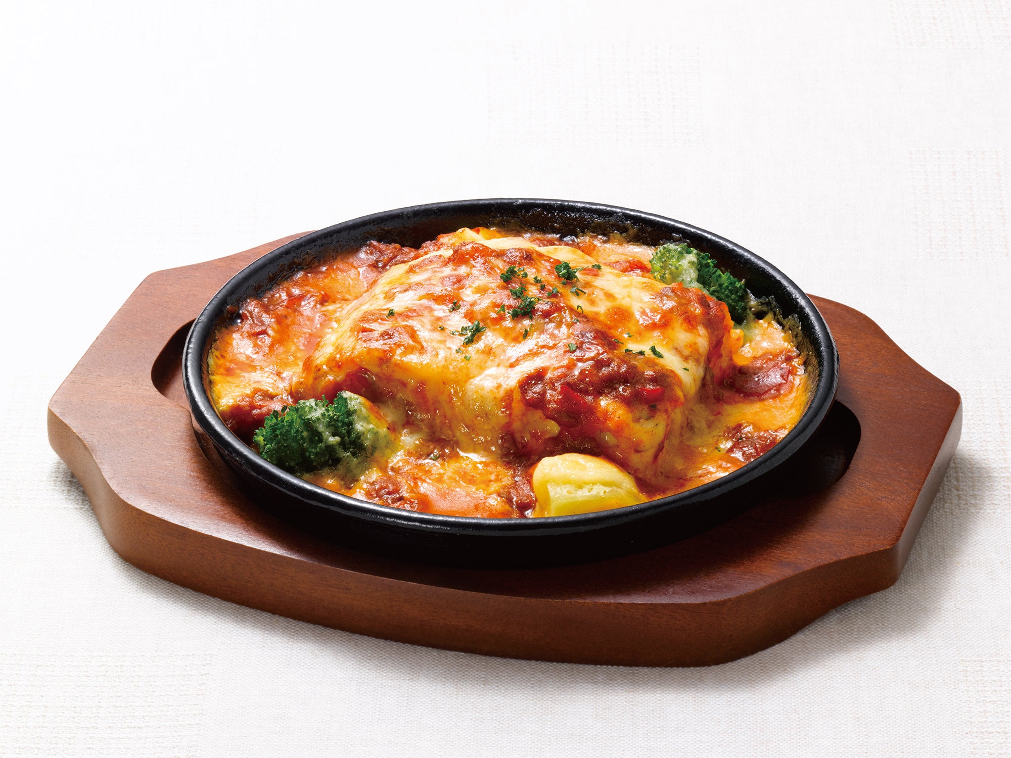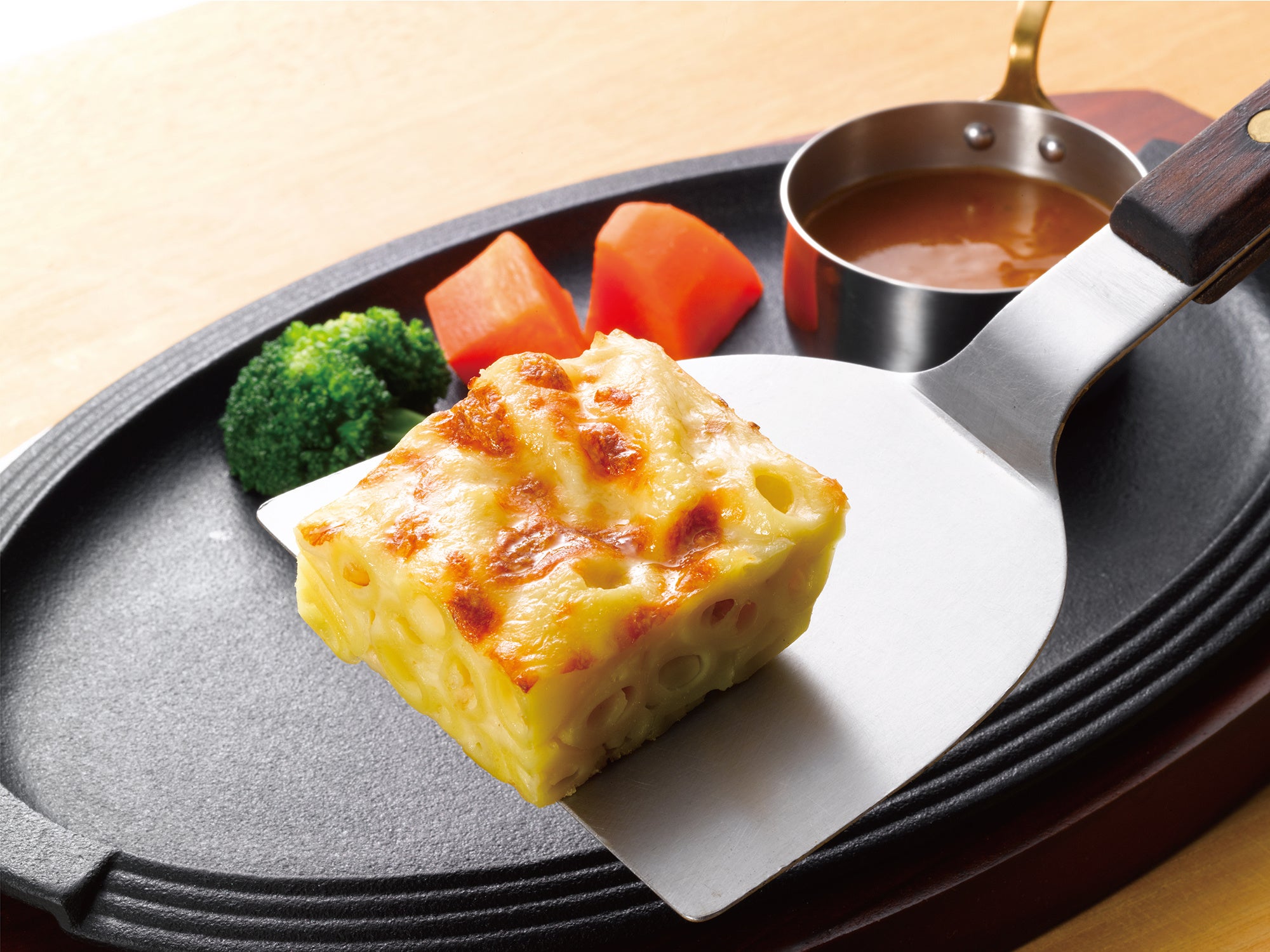 ペンネグラタンにポテト、ブロッコリーを彩りよく添え、チーズが香るモルネソースとミートソース、チーズをのせて焼き上げました。