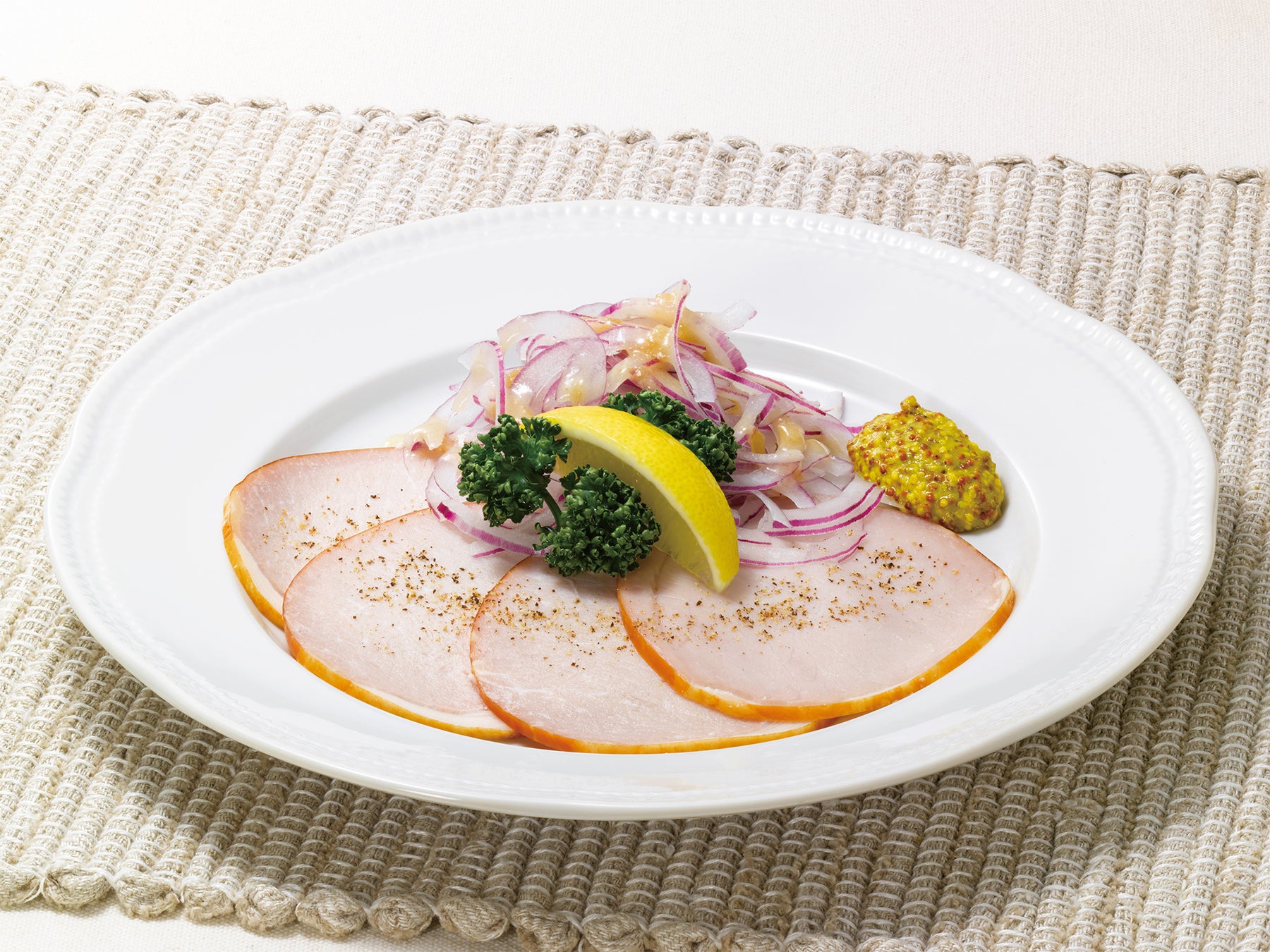 低温熟成された食べ応えがあるハムのオードブルです。レモンを絞ったりオニオンを巻いたり、粒マスタードをつけたりとアレンジしてお楽しみいただけます。