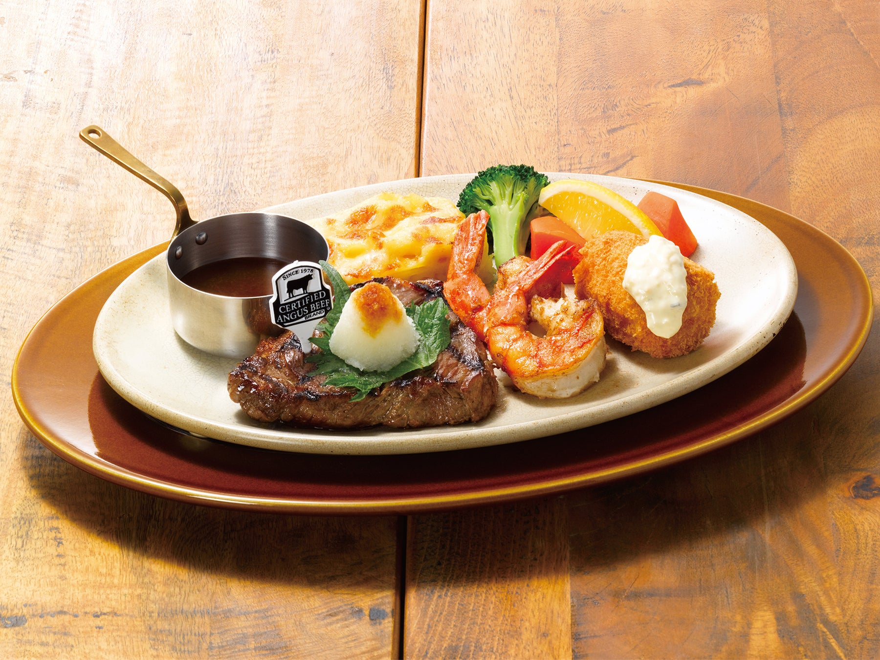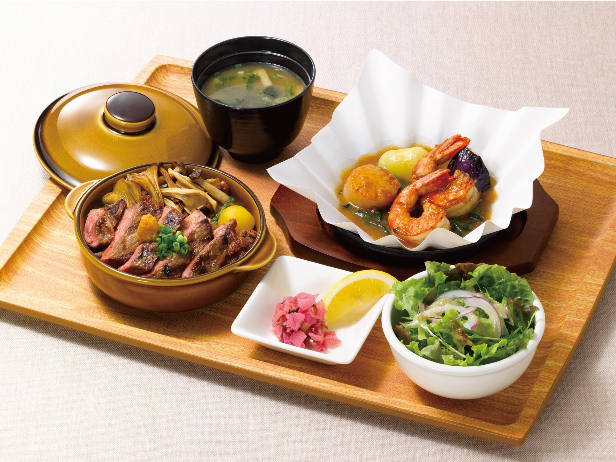 丁寧に焼き上げたアンガスサーロインステーキごはんに北海道産山わさびの醤油漬け、香り豊かな舞茸、ぶなしめじ、栗の甘露煮を添えました。ちいさなサイズの「海老と帆立のあつあつグリル」、サラダ、味噌汁、漬物付きの御膳です。