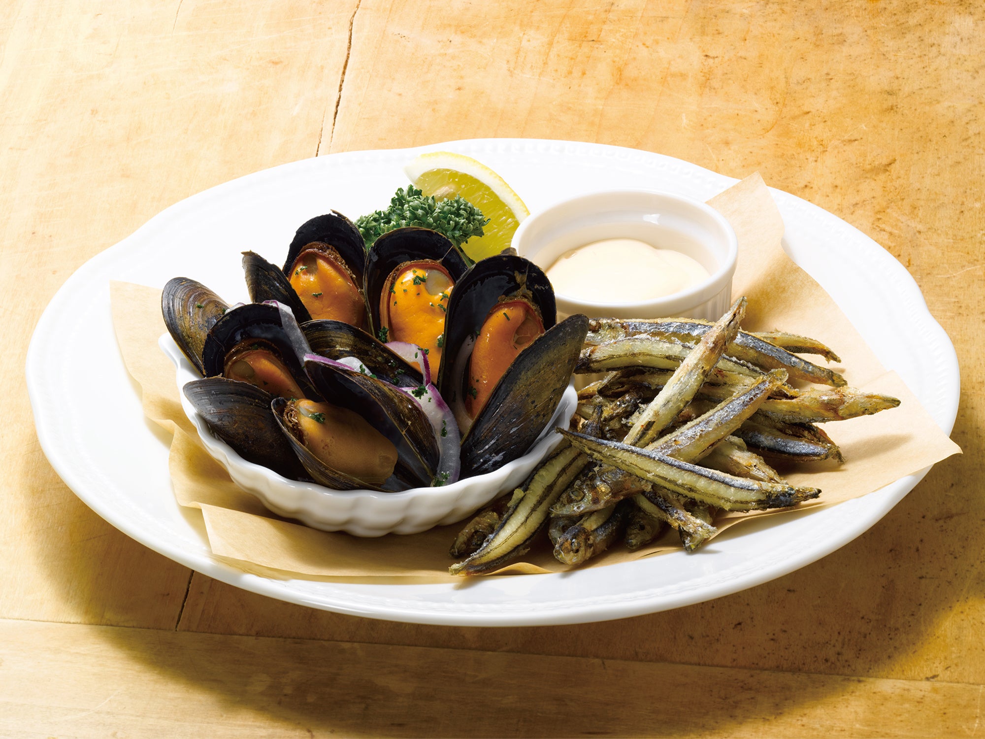 ムール貝と長崎県五島列島産のきびなごのフリットを盛り合わせました。きびなごは骨が柔らかく身もふっくら、ほんのりとした苦みと香ばしさがあとを引く美味しさです。