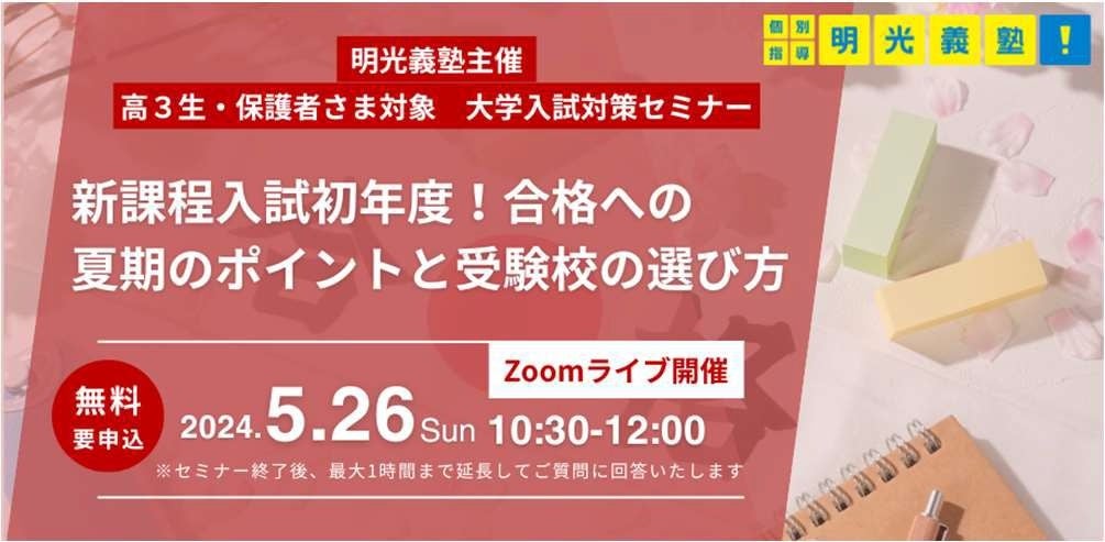 個別指導の「明光義塾」を全国展開する株式会社明光ネットワークジャパン(本社:東京都新宿区、代表取締役社長:山下 一仁)は、高3生とその保護者を対象に、新課程入試の最新受験情報と受験校の選び方についてのオンラインセミナーを開催いたします。