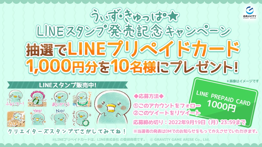 グラビティゲームアライズ株式会社(所在地:東京都中央区)は、現在制作中のスマートフォン向けバーチャルペットアプリ『うぃず・きゅっぱ』のLINEスタンプ販売を記念して、「LINEプリペイドカード1,000円分」が抽選で10名様に当たるプレゼントキャンペーンを公式Twitterにて開催したことをお知らせします。