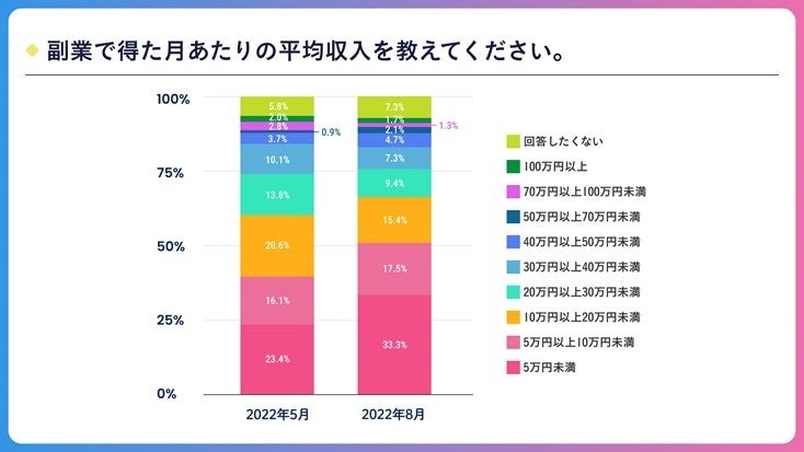 副業で得た月あたりの平均収入を訪ねたところ、「5万円未満」は33.3%、「5万円以上10万円未満」が17.5%、「10万円以上20万円未満」が15.4%、「20万円以上30万円未満」が9.4%、「30万円以上40万円未満」が7.3%。「40万円以上50万円未満」が4.7%、「50万円以上70万円未満」が2.1%、「70万円以上100万未満」が1.3%。「100万円以上」が1.7%となりました。前回同様、副業で10万円以上稼いでいる方が40%以上となりました。
