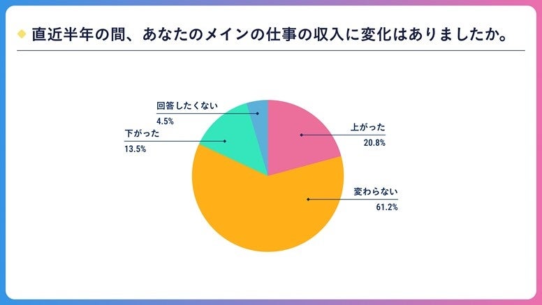 「直近半年の間、あなたのメインの仕事の収入に変化はありましたか」という質問に対して、「上がった」人は20.8%、「変わらない」人は61.2%、「下がった」人は13.5%となりました。