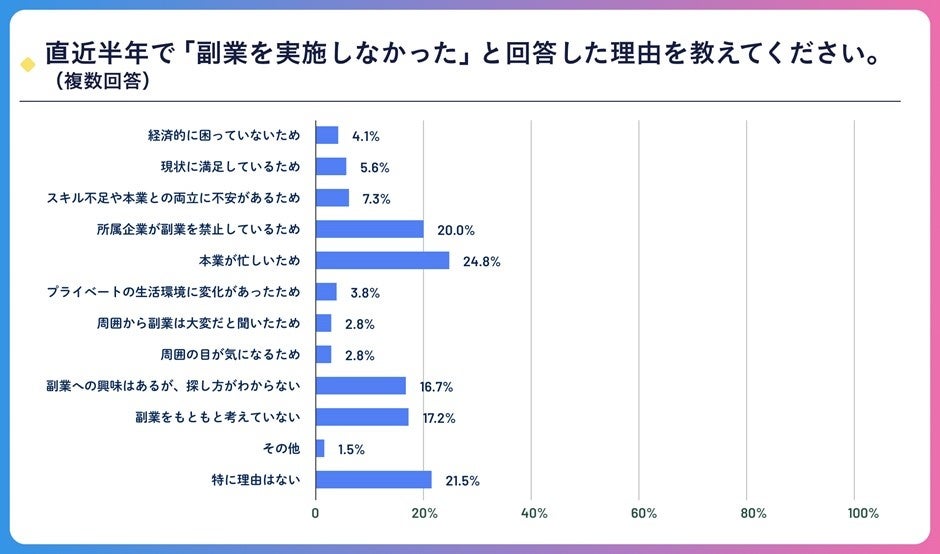 直近半年で副業を「実施しなかった」と答えた方に実施しなかった理由を尋ねると、最も多かったのは「本業が忙しいため」で24.8%でした。次いで「所属企業が副業を禁止しているため」で20.0%でした。こういった物理的に副業ができない理由以外では、「副業をもともと考えていない」が17.2%、「副業への興味はあるが、探し方がわからない」が16.7%となりました。